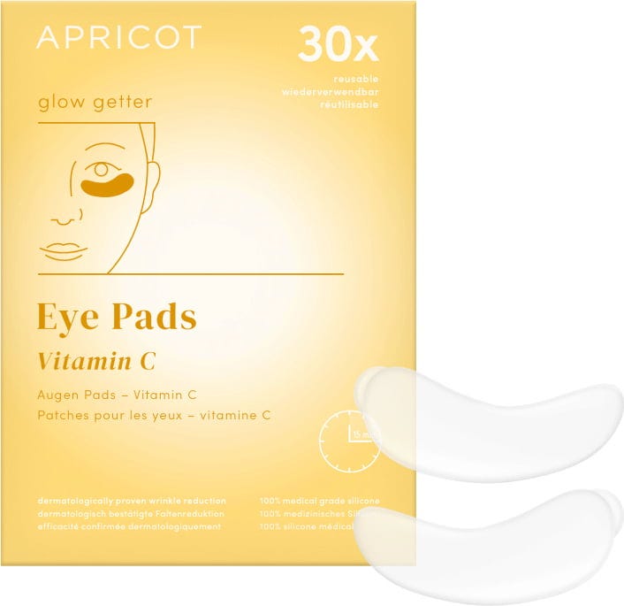 Estes tapa-olhos antienvelhecimento com vitamina C da APRICOT são fabricados em silicone de qualidade médica e podem ser reutilizados até 30 vezes. A vitamina C antioxidante nutre intensamente a pele sob os olhos e ajuda a atenuar as rídulas. Os teus olhos vão brilhar com uma tez bonita num instante.