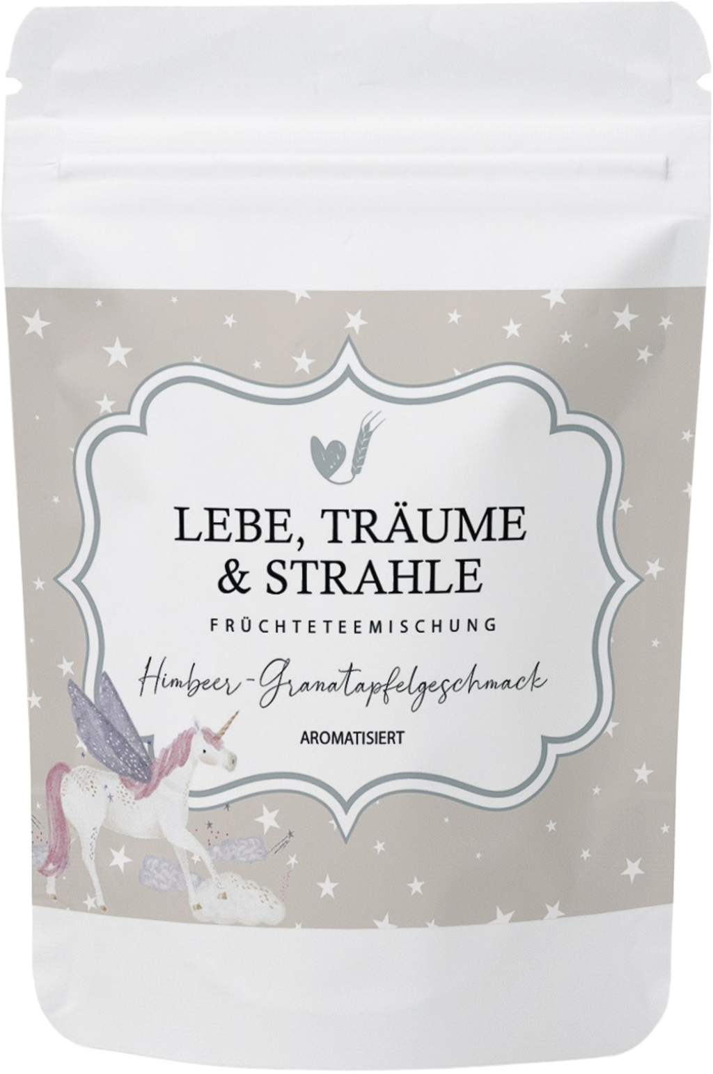 O saquinho de chá "Vive, sonha & brilha" contém uma combinação aromática de pedaços de maçã, ananás, fruta-dragão e granulado de morango e iogurte. O sabor frutado de framboesa e romã encanta em cada chávena. Ideal como prenda carinhosa para pessoas especiais.
