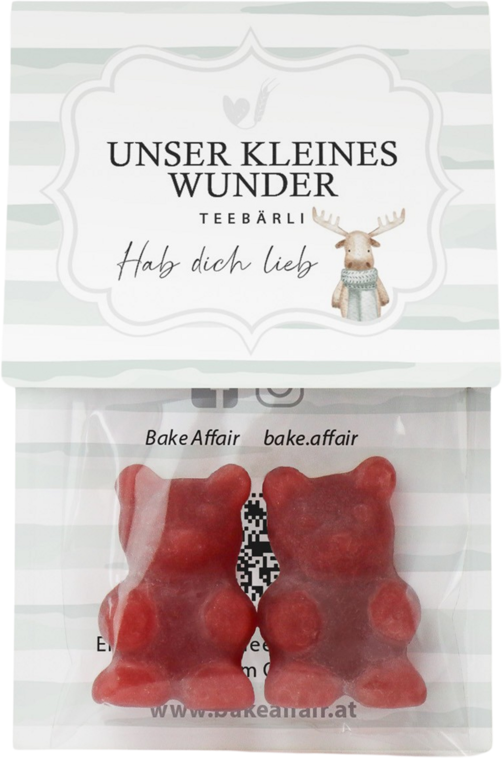 Os Ursinhos de Chá "O nosso pequeno milagre" são perfeitos para oferecer. A sua embalagem apresenta a inscrição "Adoro-te". Quando dissolvidos em água quente, transformam-se num chá de frutas aromático com um doce sabor a morango. Conforme a preferência, os Ursinhos de Chá também são deliciosos ao natural.