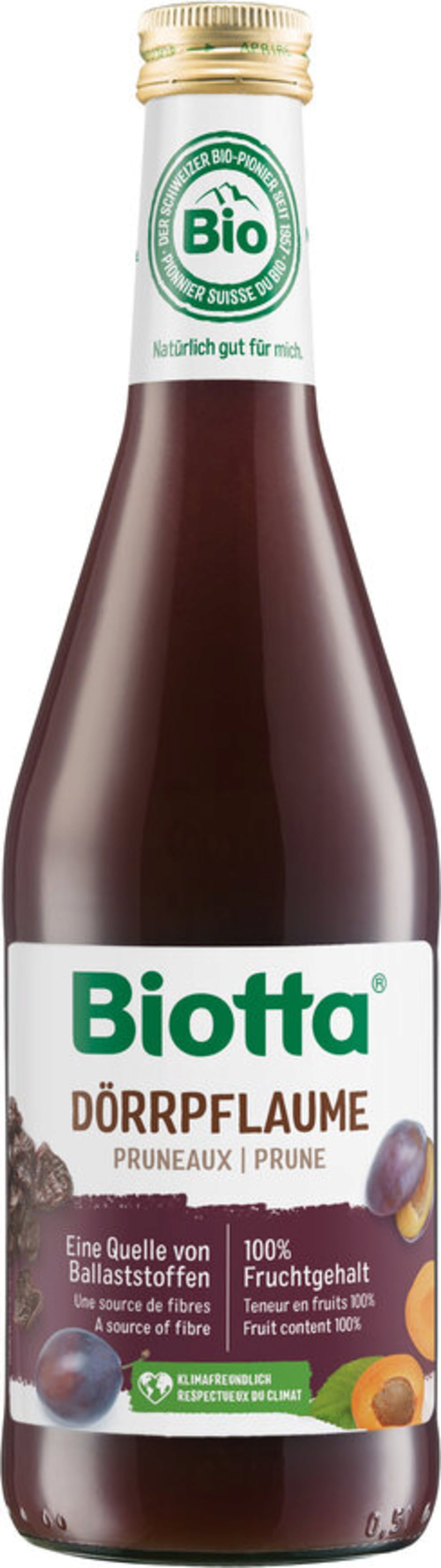 O sumo Biotta Ameixa Seca é um sumo direto 100% obtido a partir de frutas biológicas amadurecidas ao sol. Combina ameixas frescas biológicas e ameixas secas biológicas selecionadas à mão com alperces, uvas e bagas de arónia, tudo proveniente de agricultura biológica. Esta composição cuidadosamente escolhida oferece um sabor frutado e ligeiramente ácido, sendo também uma fonte natural de fibras e potássio.