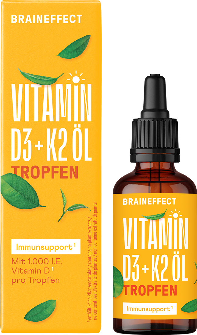 As gotas Vitamin D3+K2 de BRAINEFFECT podem ser tomadas durante todo o ano. A vitamina D contribui para a manutenção de ossos normais. O óleo MCT utilizado é obtido do coco. As gotas são sem sabor. O prático frasco com pipeta facilita a dosagem.