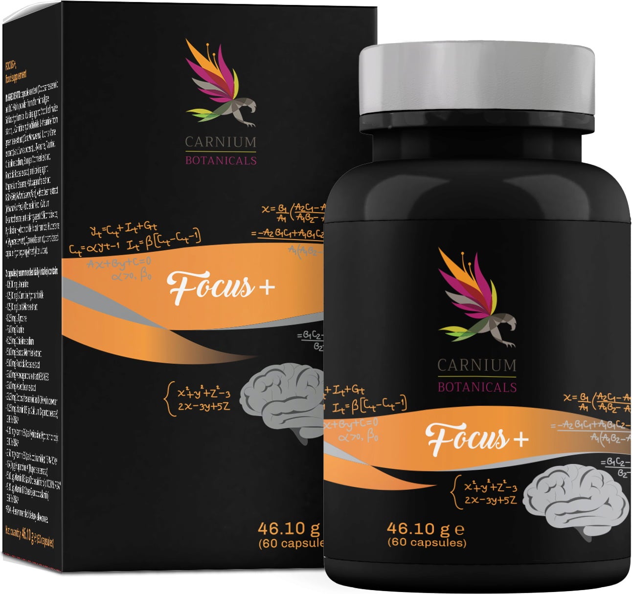 O Focus+ da Carnium Botanicals contém uma variedade de vitaminas e minerais. As cápsulas veganas incluem, entre outros, L-teanina, L-carnitina, extrato de raiz-de-rosa, extrato de ashwagandha, vitaminas do complexo B e vitamina D3.
