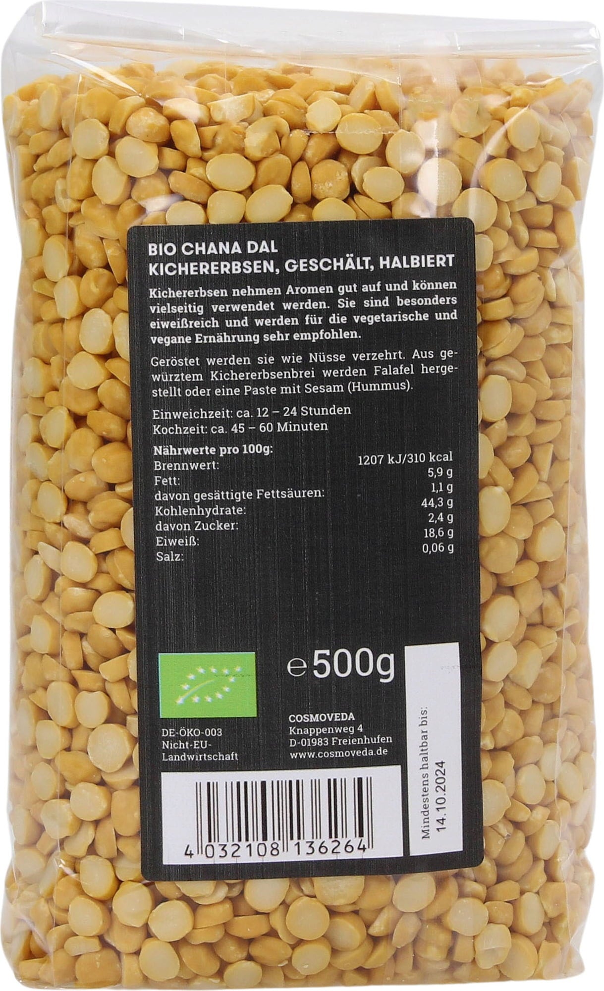 Cosmoveda Chana Dal – Grão-de-Bico descascado e partido Bio, 500 g