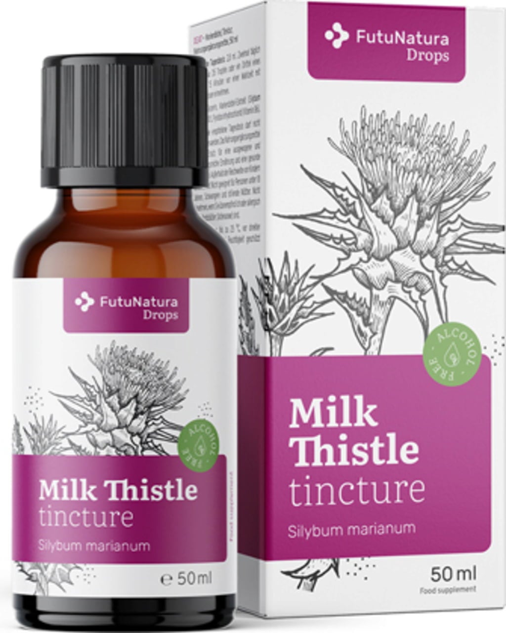 A tintura de cardo-mariano pertence à linha de produtos FutuNatura Drops e é apresentada num frasco prático com conta-gotas, permitindo uma dosagem simples e precisa.