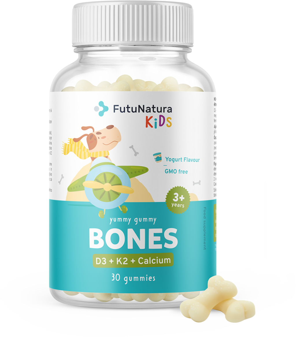 As gomas BONES da FutuNatura foram especialmente desenvolvidas para crianças e oferecem uma combinação de cálcio e das vitaminas D3 e K2. Este suplemento alimentar foi concebido para complementar a ingestão diária de nutrientes do teu filho.
