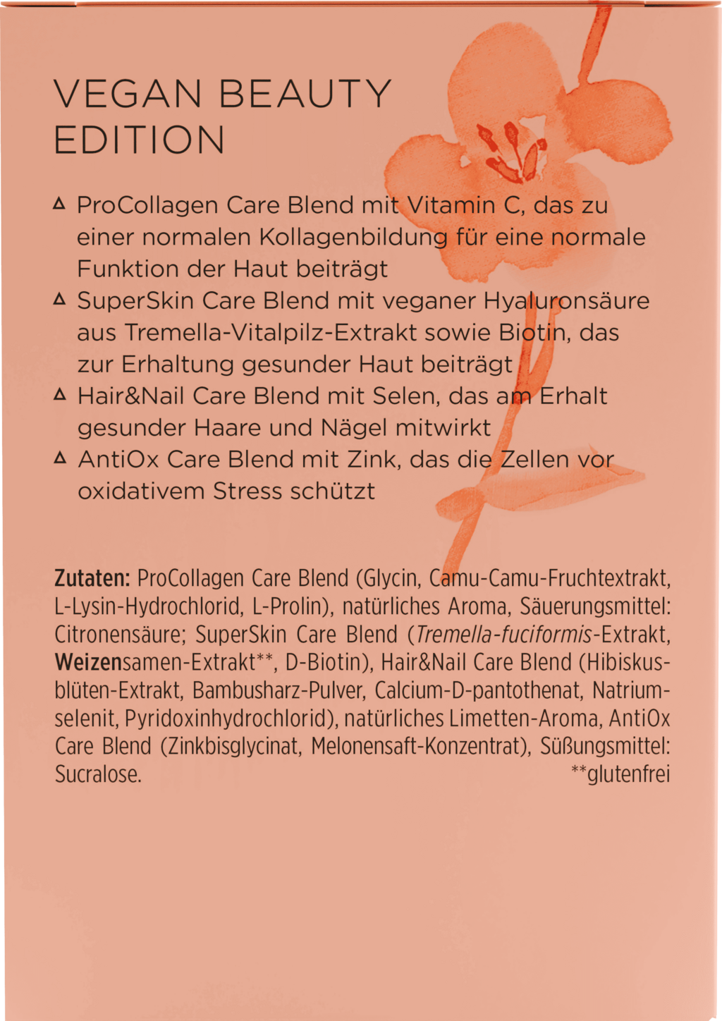 ProCollagen Care Blend (Glicina, Extrato de fruto de camu-camu, L-lisina cloridrato, L-prolina), Aroma natural, Acidulante (Ácido cítrico), Superskin care blend (Extrato de Tremella fuciformis, Extrato de sementes de trigo[1], D-biotina), Hair&Nail Care Blend (Extrato de flores de hibisco, Resina de bambu em pó, Cálcio D-pantotenato, Selenito de sódio, Piridoxina cloridrato), Aroma de lima, AntiOx Care Blend (Bisglicinato de zinco, Concentrado de sumo de melão), Adoçante (Sucralose)