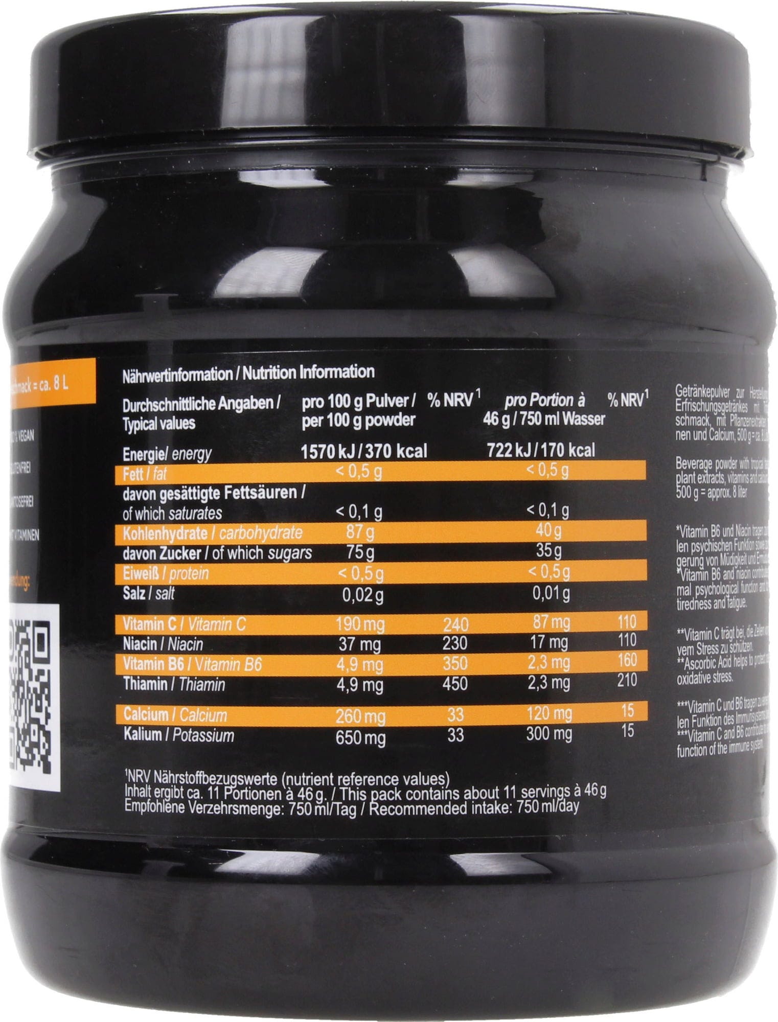 Glucose, Açúcar, Maltodextrina, Ácido cítrico[1], Aroma, Fosfato de potássio, Latato de cálcio, Mistura de vitaminas (Vitamina C (ácido ascórbico), Vitamina B3 (Niacina), Vitamina B6 (piridoxina), Vitamina B1 (tiamina)), Extrato de folhas de Melissa, Folhas de salva, Extrato de gengibre, Goma de guar[2], Beta-caroteno[3]