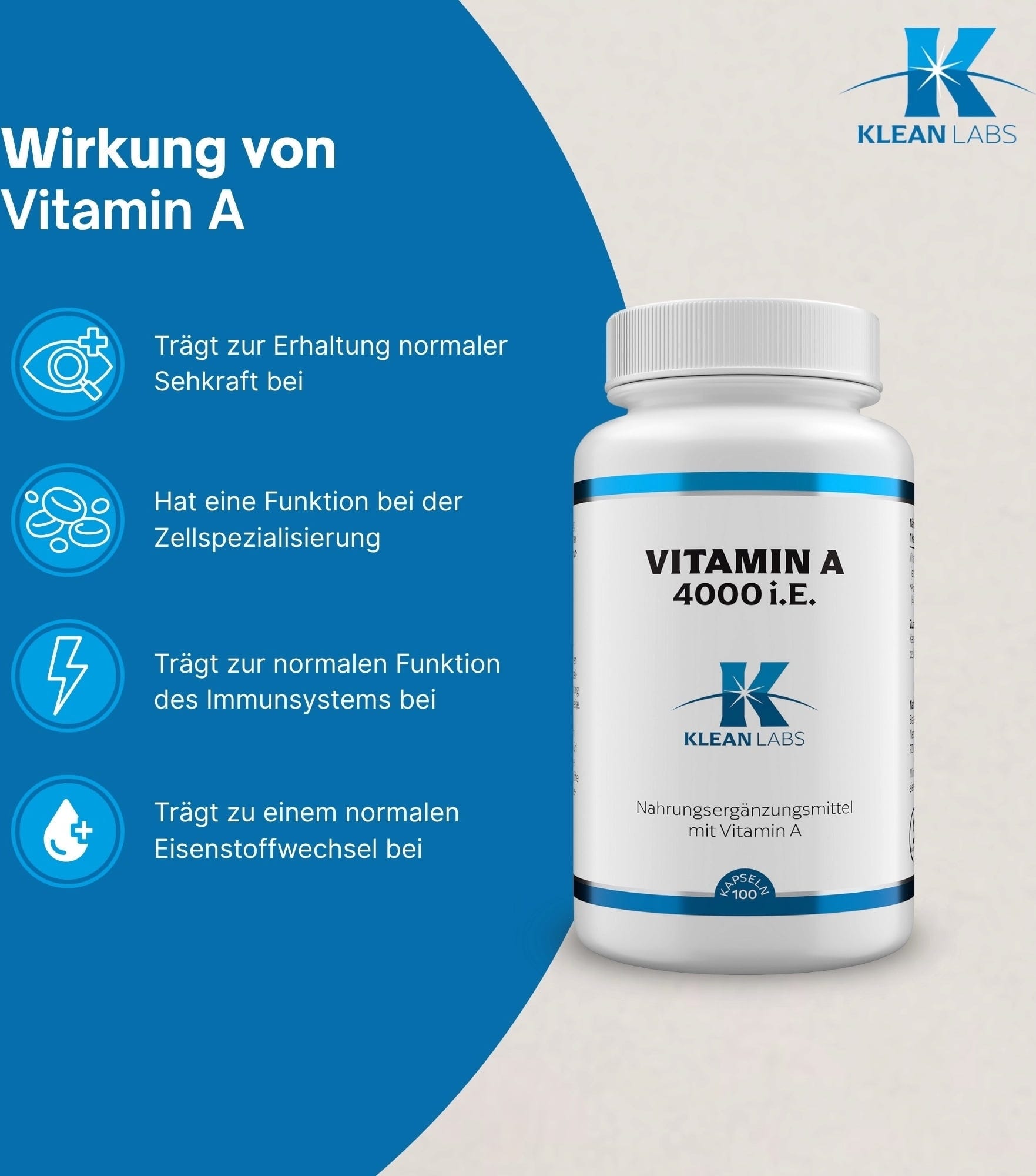 KLEAN LABS Vitamina A 4000 U.I., 100 Cápsulas