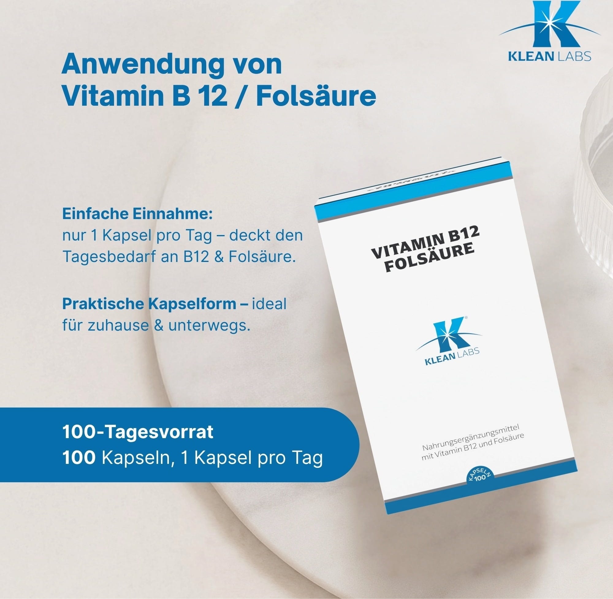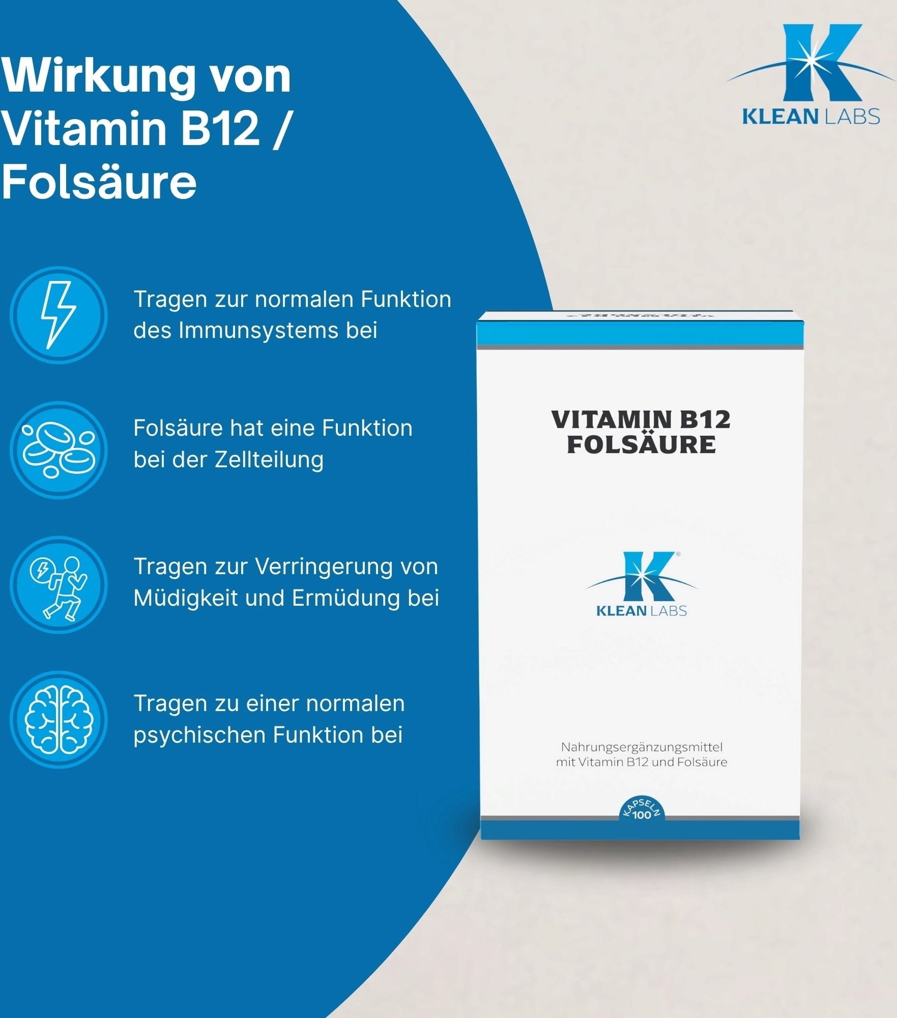 KLEAN LABS Vitamina B12 Ácido Fólico, 100 Cápsulas
