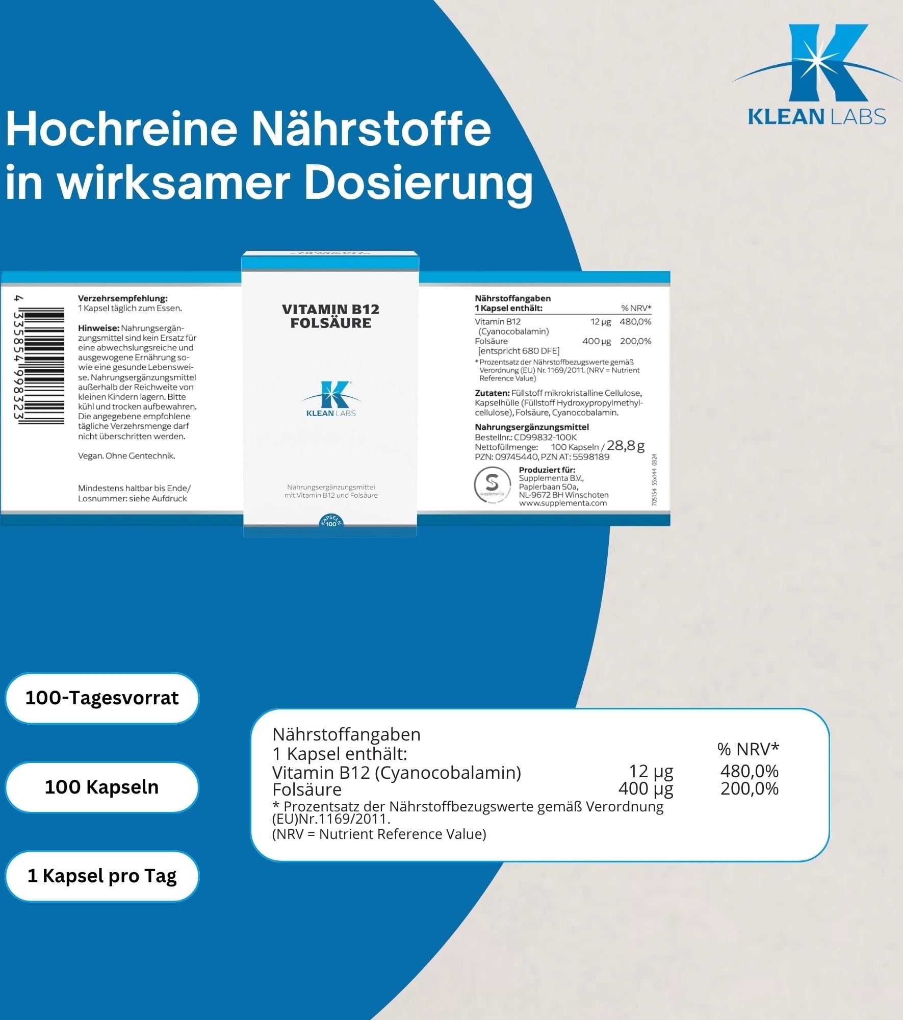 Como o corpo não pode produzir vitamina B12 por conta própria, as cápsulas de vitamina B12 e ácido fólico da Klean Labs são suplementos dietéticos ideais. Graças ao seu invólucro de cápsula à base de plantas, também é adequado para dietas vegetarianas e veganas. As cápsulas são livres de aromatizantes, corantes e conservantes.