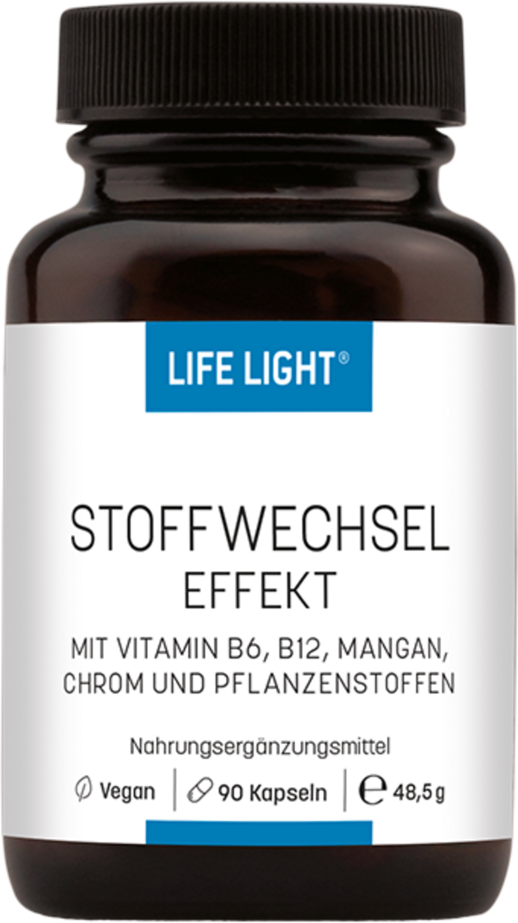 O Life Light Metabolism Effect contém um complexo de micronutrientes vegetais com 2 enzimas e 2 vitaminas e minerais cada.
