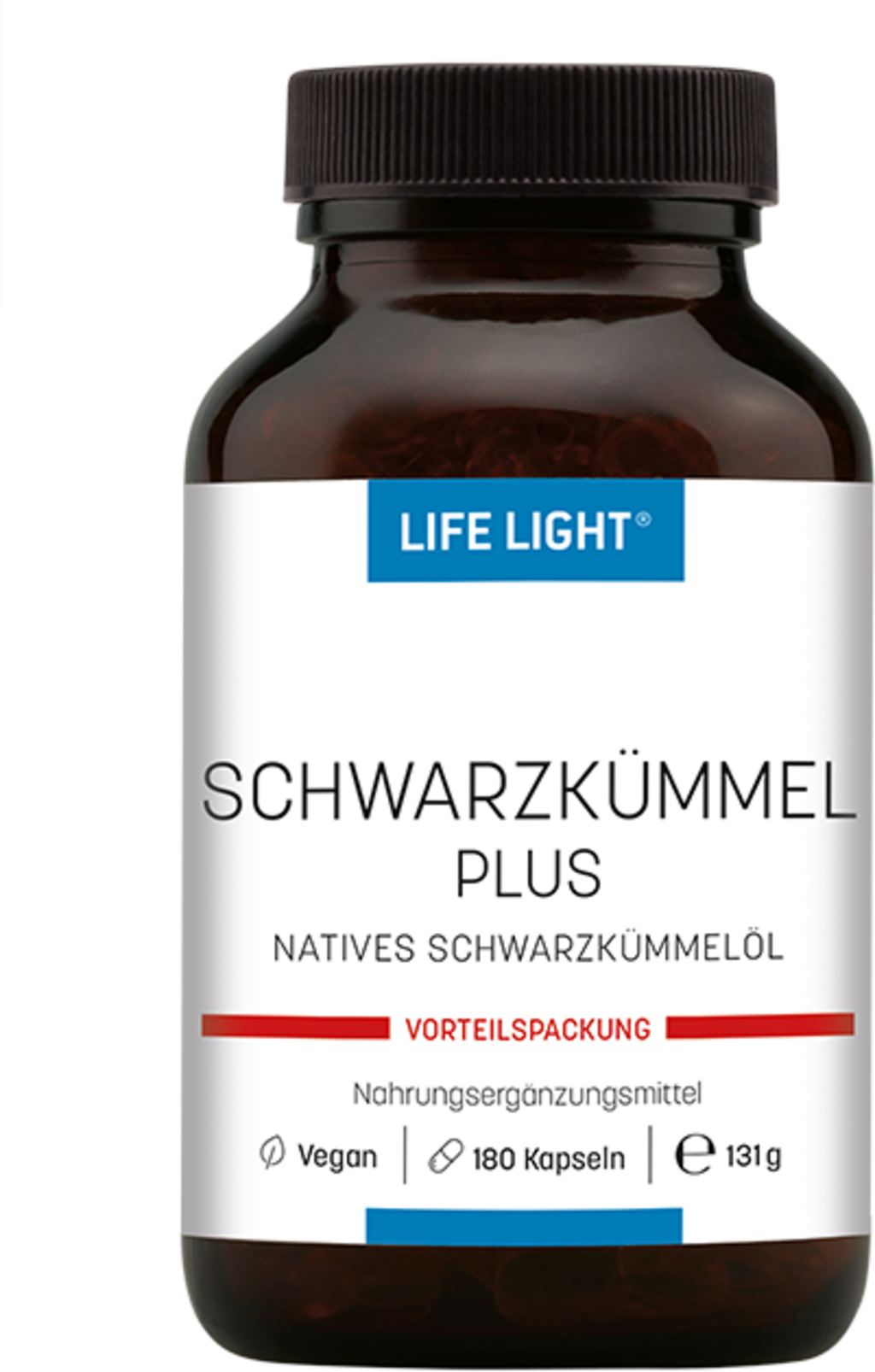 Life Light® Black Cumin plus contém óleo de cominho preto nativo de alta qualidade, proveniente das sementes do verdadeiro cominho preto (Nigella sativa). O óleo é suavemente prensado a frio, preservando assim um espetro natural de ingredientes valiosos, tais como ácidos gordos polinsaturados, óleos essenciais e substâncias amargas vegetais.