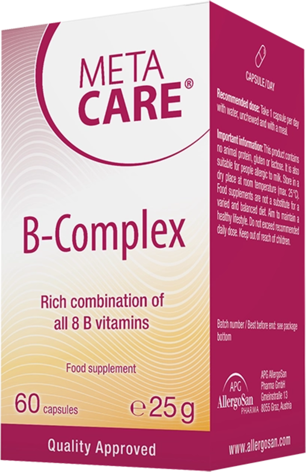O META-CARE® B-Complex fornece-te todas as 8 vitaminas B em cápsulas – dosadas de forma ideal e perfeitamente equilibradas. Além disso, as cápsulas contêm Inositol e Colina, que foram anteriormente conhecidos como vitaminas B8 e B4. As cápsulas são 100% veganas e livres de organismos geneticamente modificados.