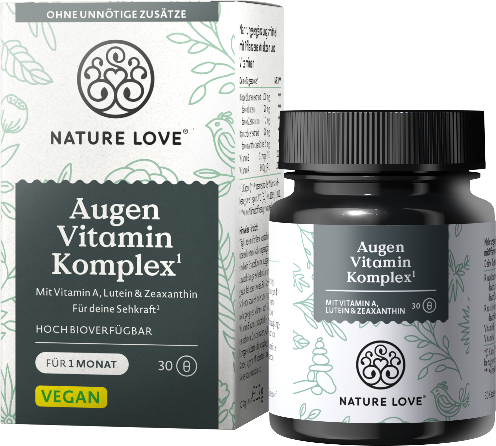 Ao trabalhar longas horas ao computador, ao usar lentes de contacto ou, de um modo geral, com o avançar da idade – os nossos olhos enfrentam diariamente muitos desafios. As cápsulas veganas Augen Vitamin Komplex da Nature Love contêm uma valiosa combinação de vitamina A, vitamina E, extrato de calêndula e extrato de mirtilo para apoiar a saúde ocular.