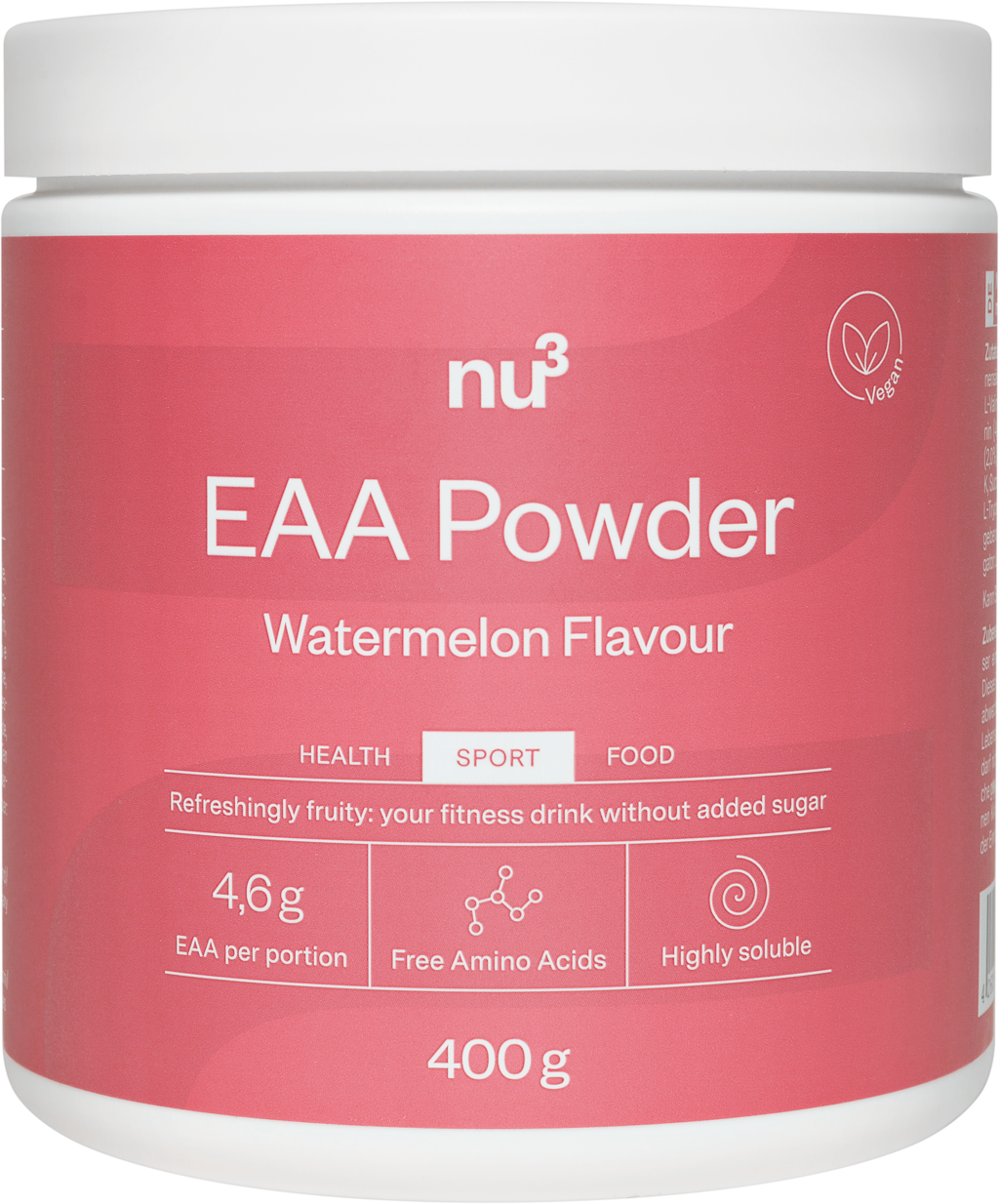 Maximiza o teu treino com uma dose extra de aminoácidos essenciais. O EAA em pó da nu3 fornece-te tudo o que precisas para atingires os teus objetivos desportivos – sem adição de açúcar e 100 % vegan.