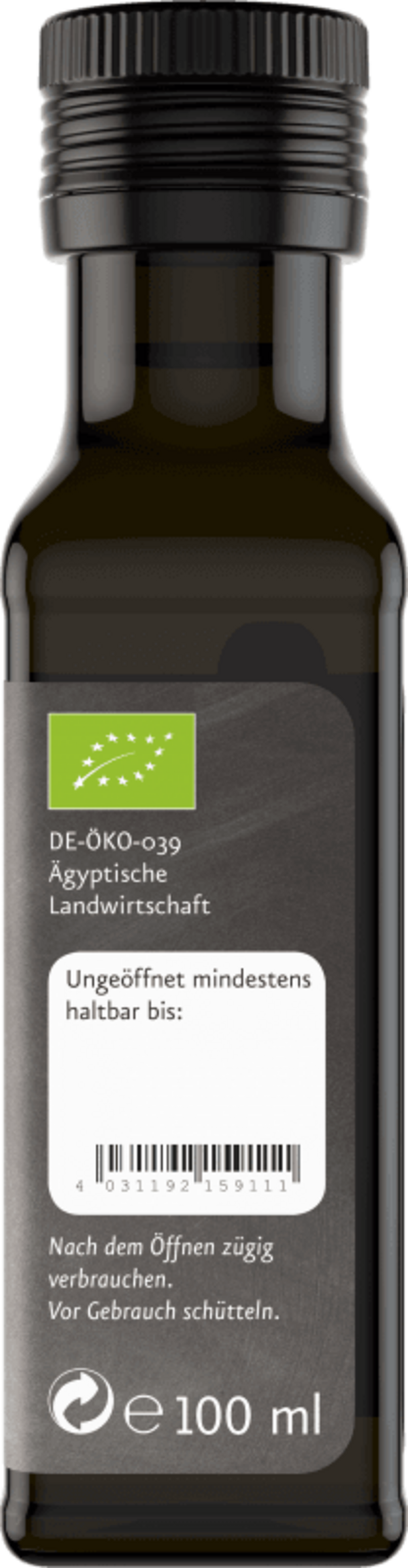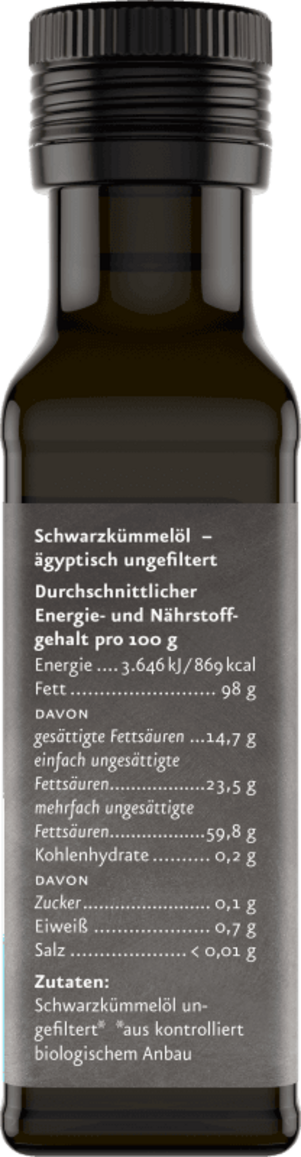 Este óleo é suavemente prensado a frio a partir de cominhos pretos egípcios. Como não é filtrado, contém ainda todas as matérias turvas e em suspensão e é mais espesso do que os óleos filtrados. O seu sabor intenso e ligeiramente pungente permite refinar uma grande variedade de pratos quando doseado cuidadosamente.