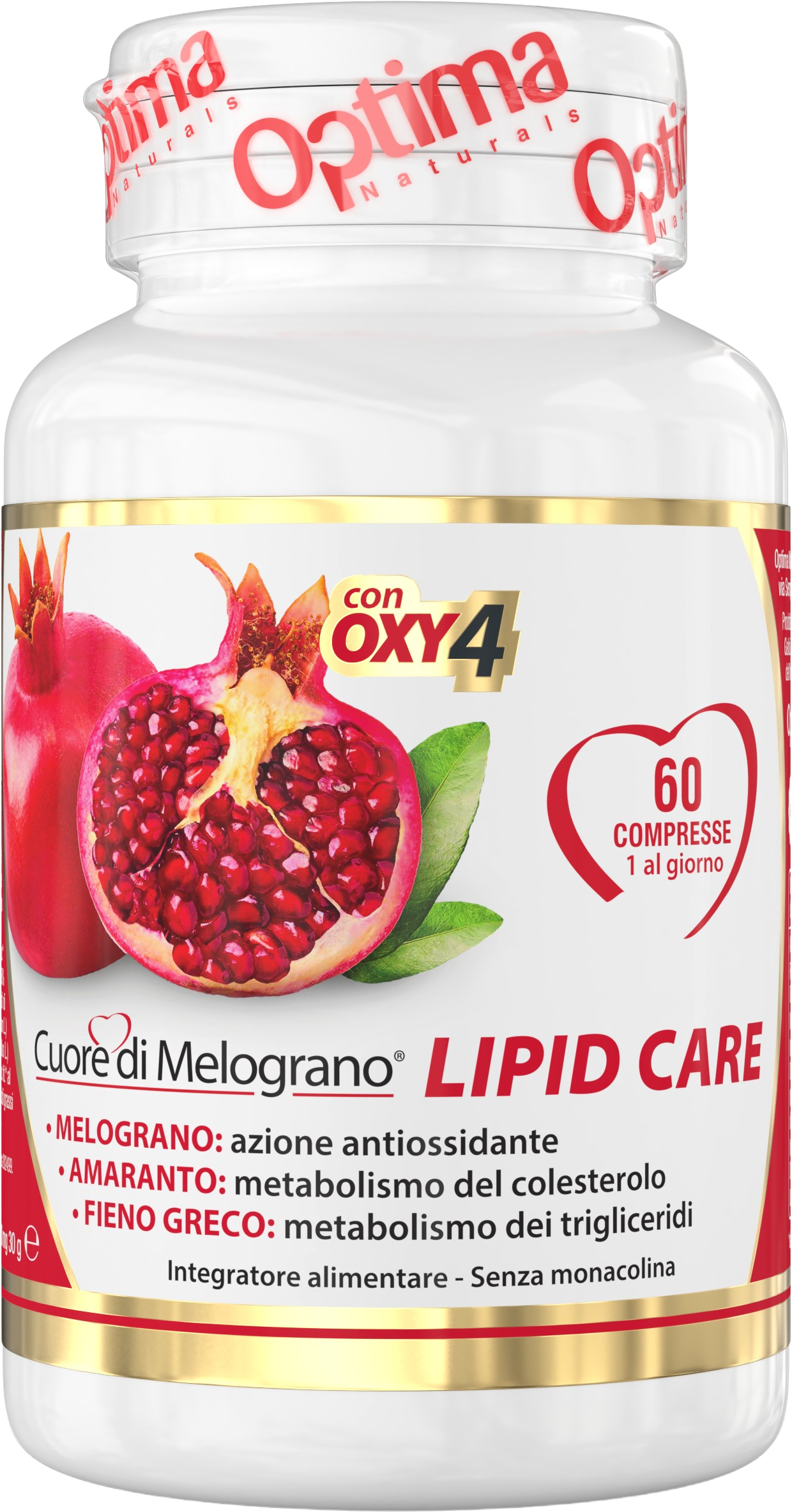 Os comprimidos Lipid Care da Optima Naturals são produzidos sem monacolina à base de feno-grego e amaranto. O complexo Oxy4 integrado contém quercetina e extractos titulados de romã, uva vermelha e mirtilo. Os comprimidos são vegan e isentos de glúten e de lactose.