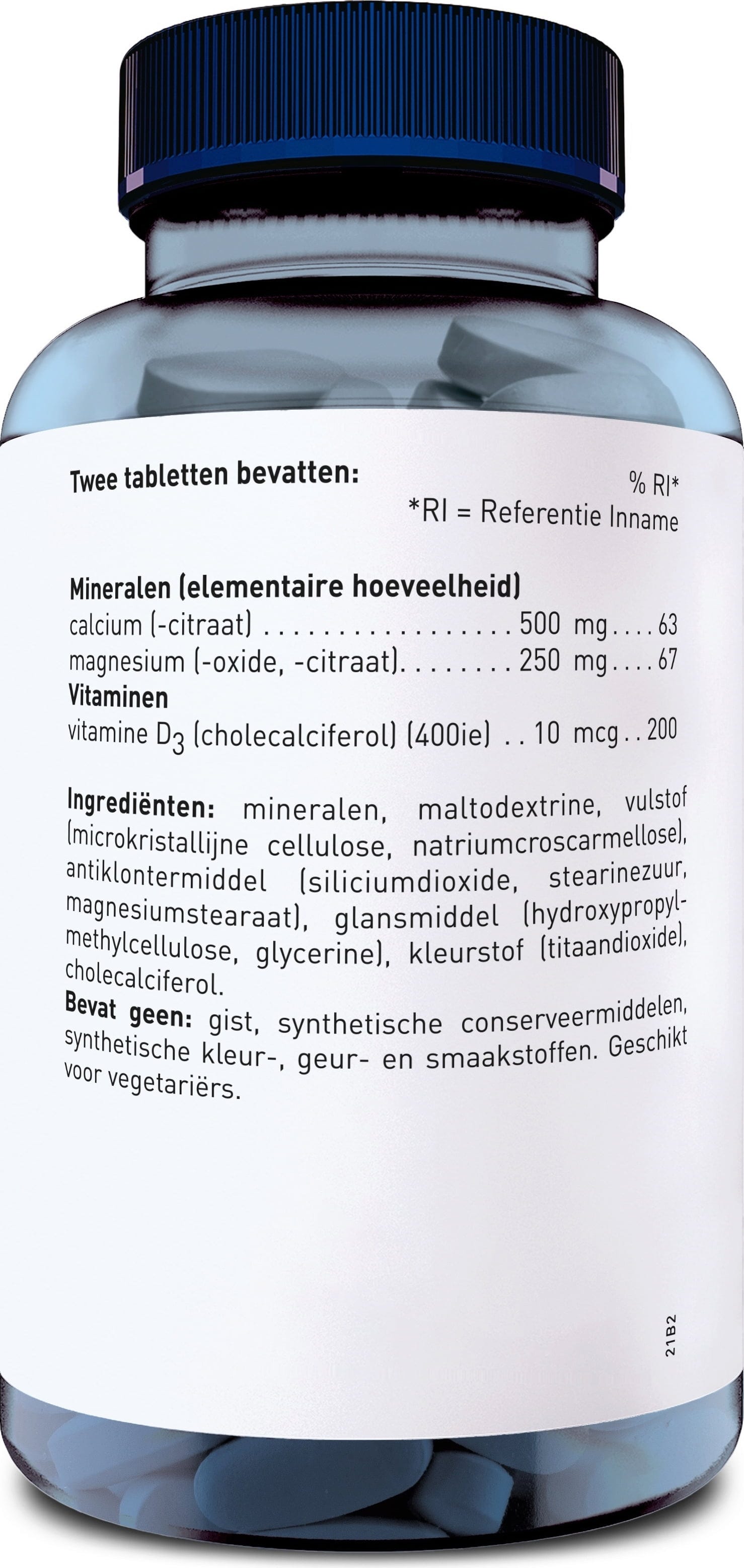 Sais de cálcio do ácido cítrico, Sais de magnésio do ácido cítrico, Magnésio (como óxido), Enchimento (Mikrokristalline Cellulose, Fosfatos de cálcio, Hidroxipropilcelulose), Agente de libertação (Ácidos gordos comestíveis, Sais de magnésio dos ácidos gordos, Talco), Glacê (Hidroxipropilmetilcelulose, Isomalt, Cera de carnaúba), Corante (Carbonato de cálcio), Colecalciferol, Trigylceride