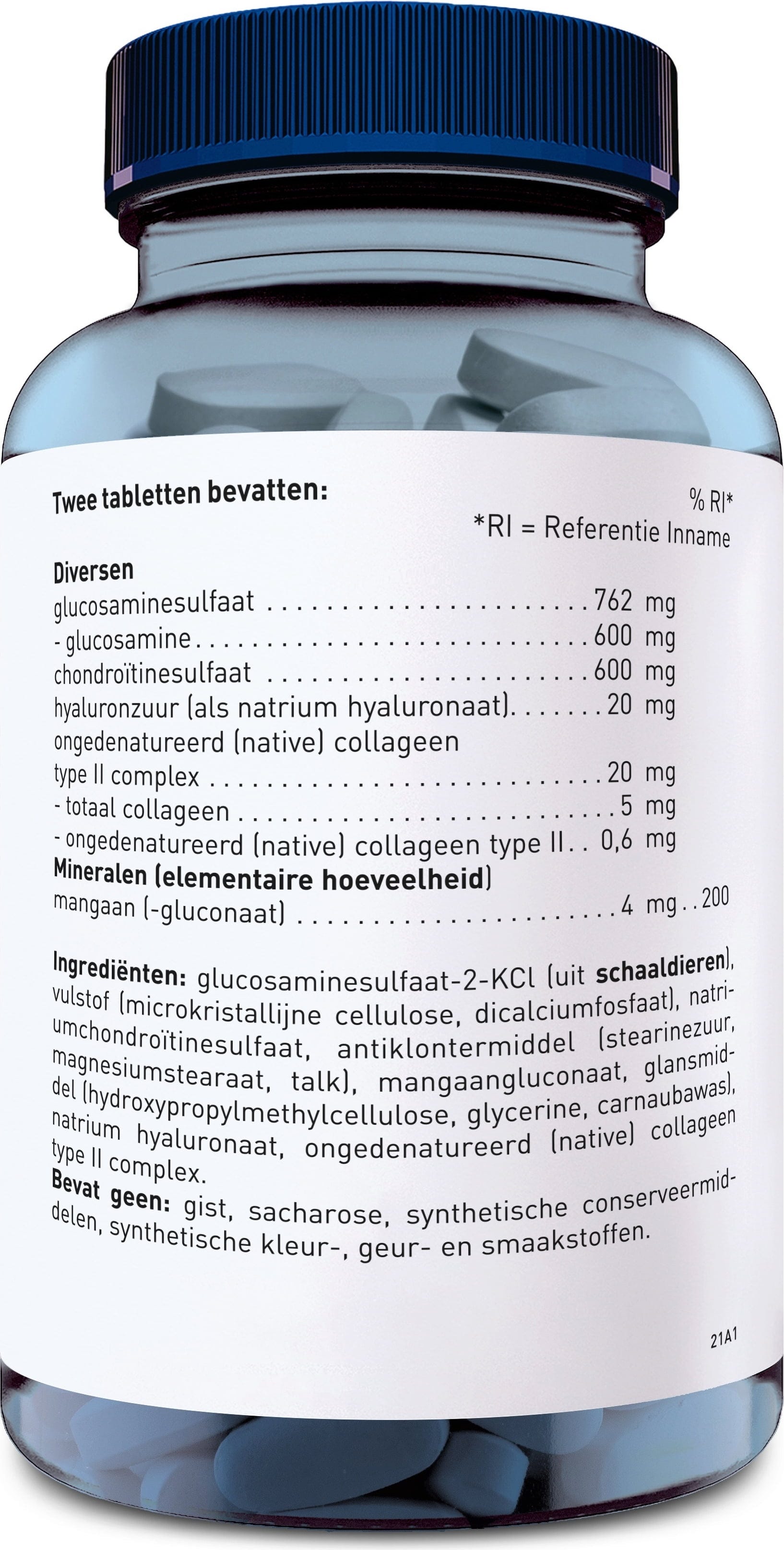 Glucosamina sulfato (Schalentiere), Enchimento (Mikrokristalline Cellulose, Fosfatos de cálcio), Condroitina sulfato de sódio, Agente de libertação (Ácidos gordos comestíveis, Sais de magnésio dos ácidos gordos, Talco), Gluconato de manganês, Glacê (Hidroxipropilmetilcelulose, Glicerina, Cera de carnaúba), Natriumhyaluronat, Colagénio não desnaturado de tipo II