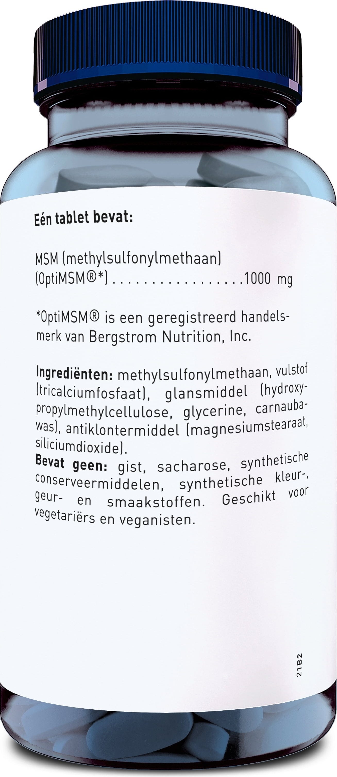 Este produto disponibiliza-te metilsulfonilmetano (MSM) numa dosagem elevada de 1000 mg por comprimido. O MSM é um composto orgânico de enxofre que ocorre naturalmente em diversos alimentos. Com este produto, podes complementar de forma direcionada a tua alimentação diária com esta substância.