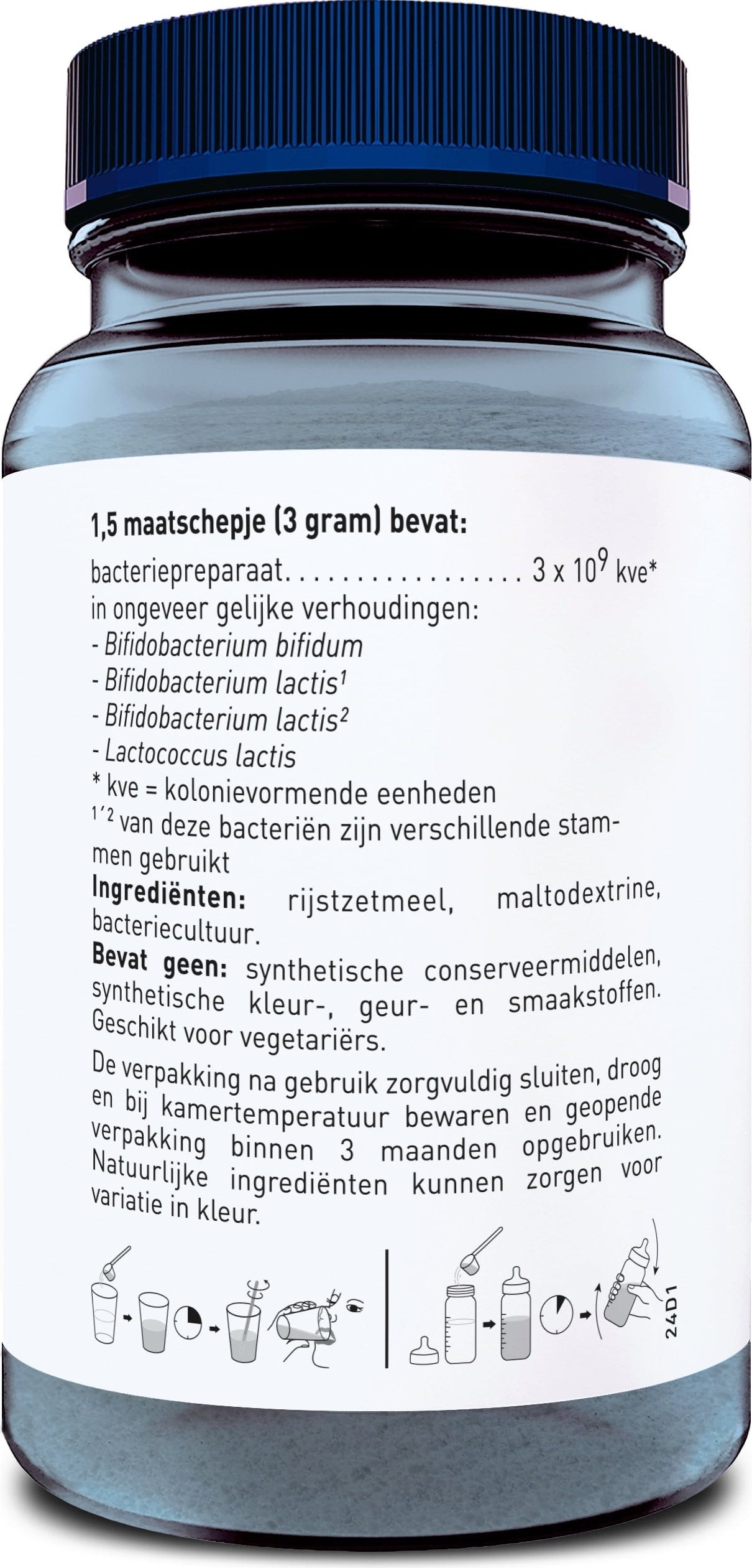 A forma de pó permite que o produto seja utilizado de forma flexível. A fórmula não contém quaisquer aditivos desnecessários, tais como corantes artificiais ou conservantes, e é também adequada para vegetarianos. Isto permite integrar facilmente uma quantidade precisamente equilibrada de microrganismos numa rotina nutricional diária.