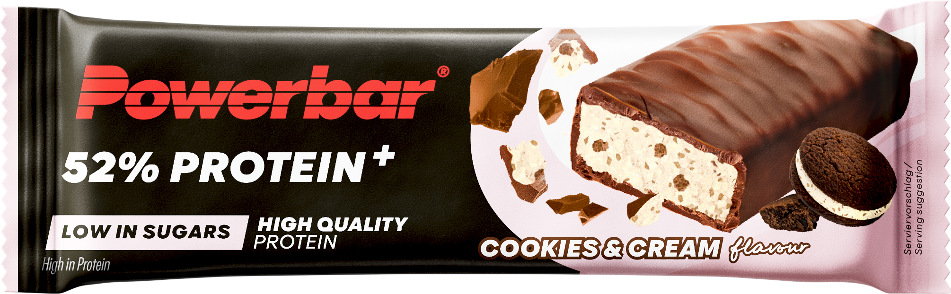 A barra 52% Protein Plus da PowerBar fornece 26 g de proteína por barra, com um alto teor de proteína e menos açúcar. Além disso, a sua fórmula não contém Aspartame. Com 52% de proteína, é a campeã da gama de barras proteicas. Está listada na Kölner Liste®.