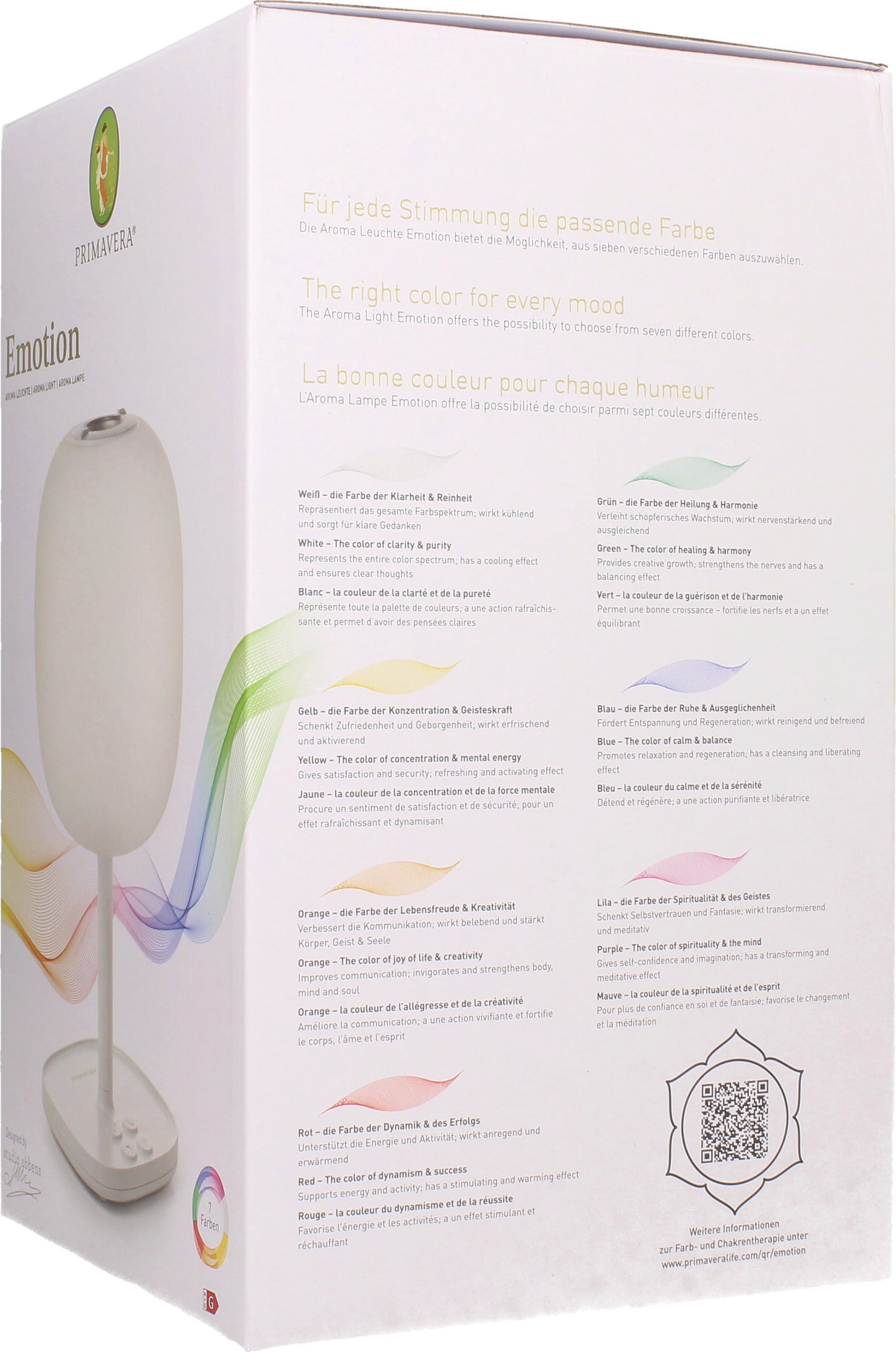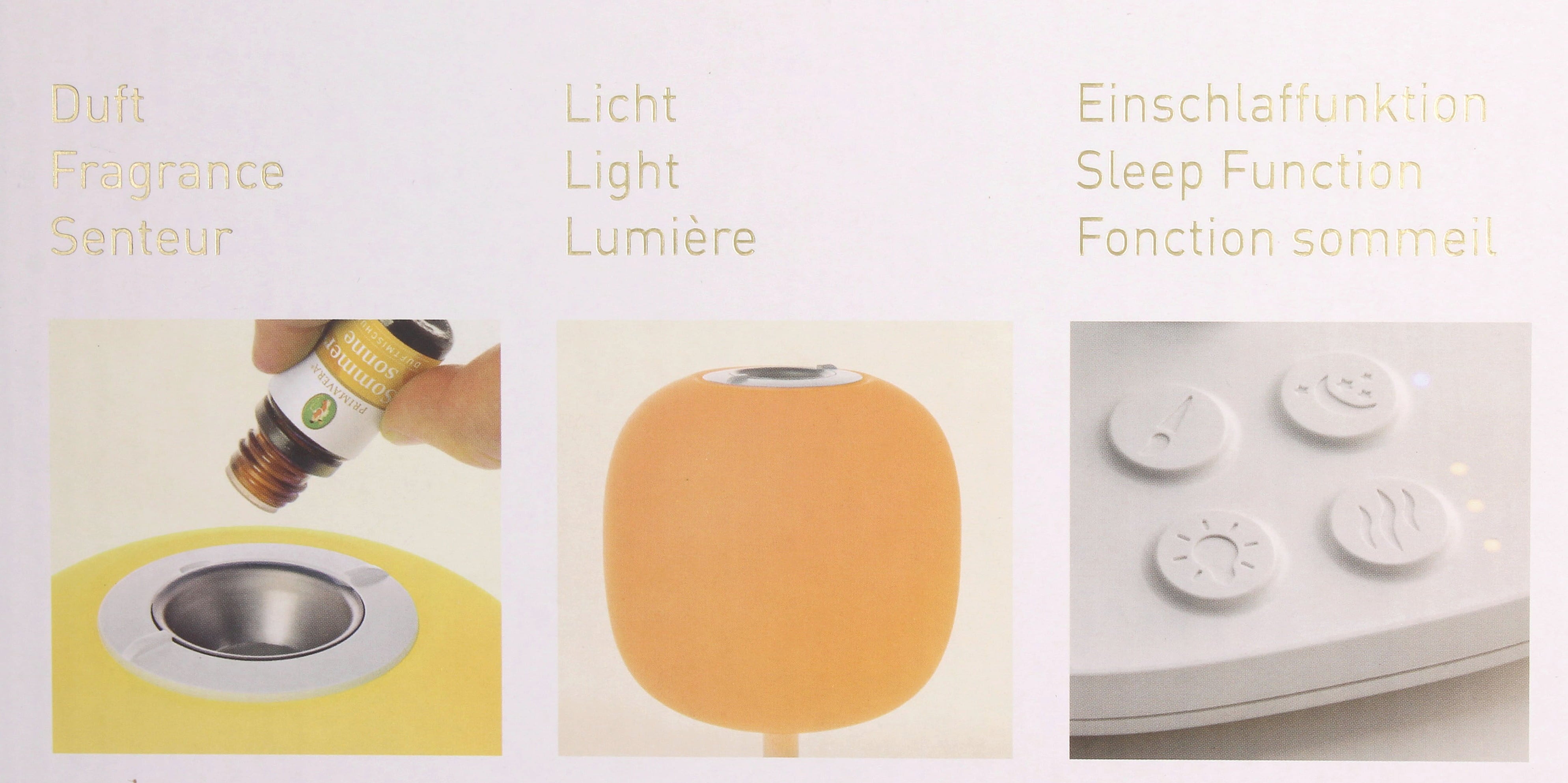 Fragrância e luz na sua forma mais bela – esta elegante lâmpada aromática alia aromaterapia e terapia luminosa, proporcionando uma experiência de bem-estar para corpo, mente e espírito. Seis modos de cor diferentes ou luz branca quente criam uma iluminação harmoniosa, enquanto os óleos essenciais difundem um aroma agradável no ambiente, sem necessidade de água.
