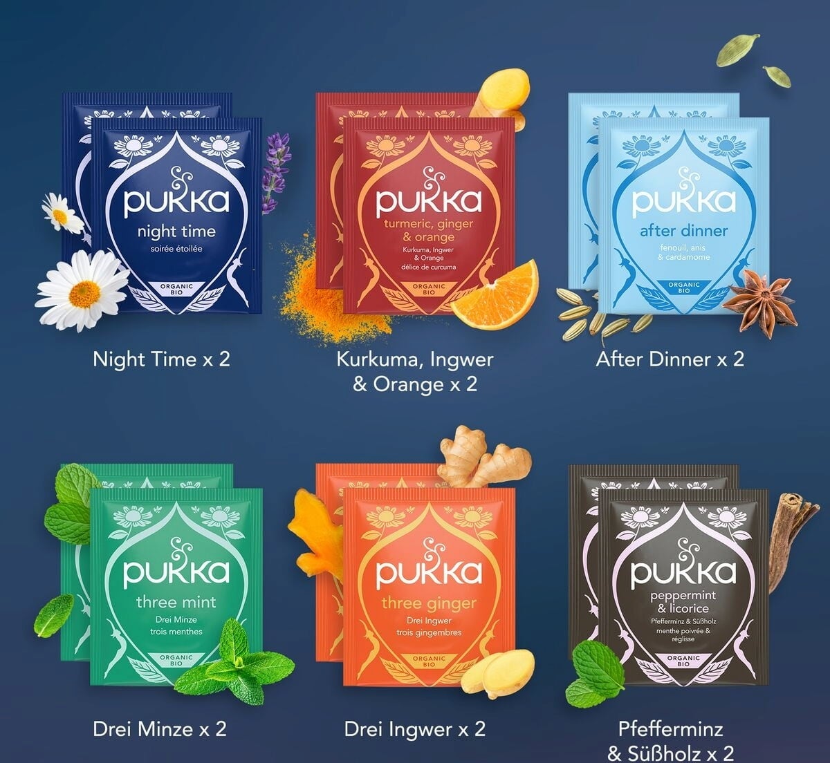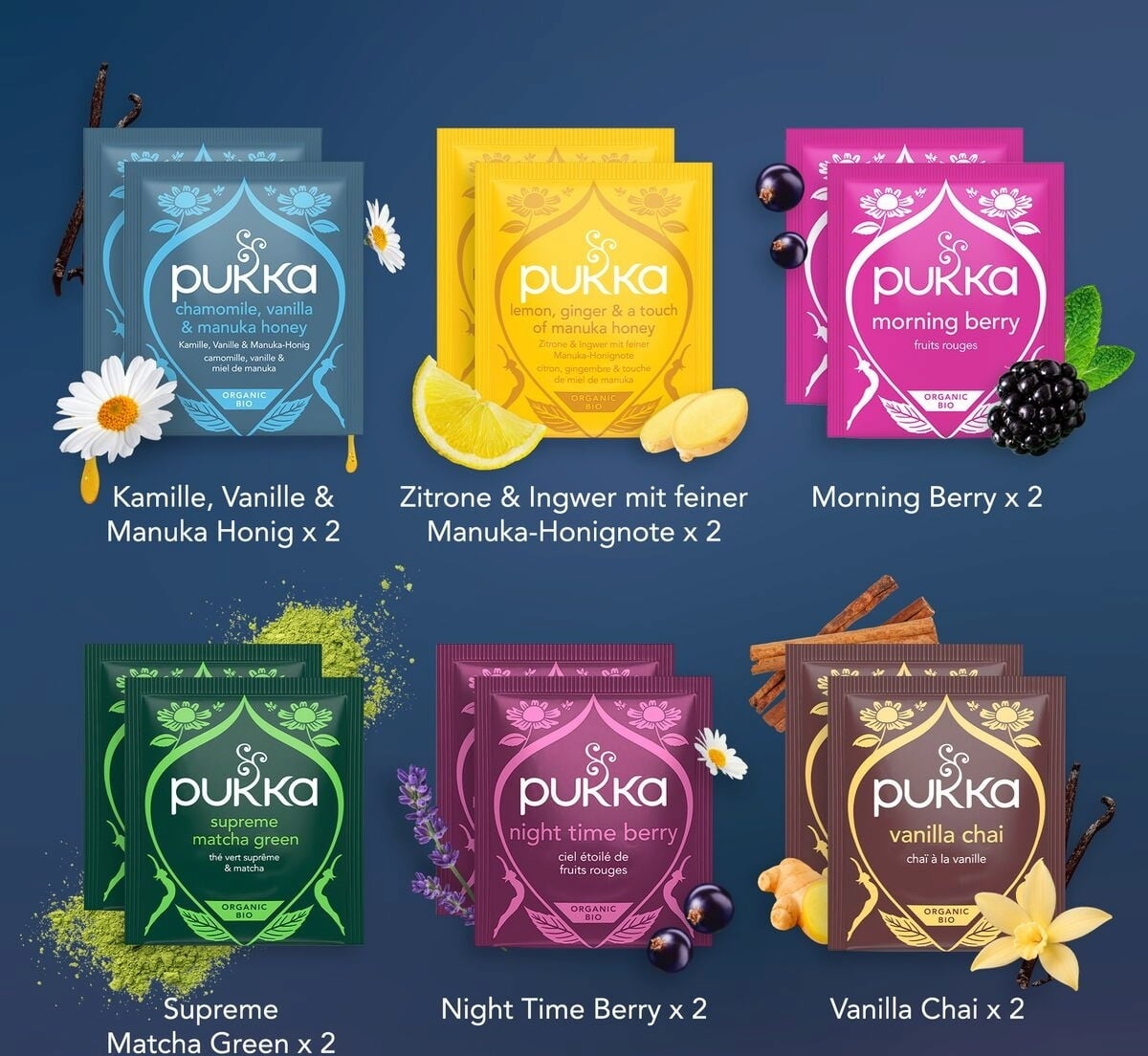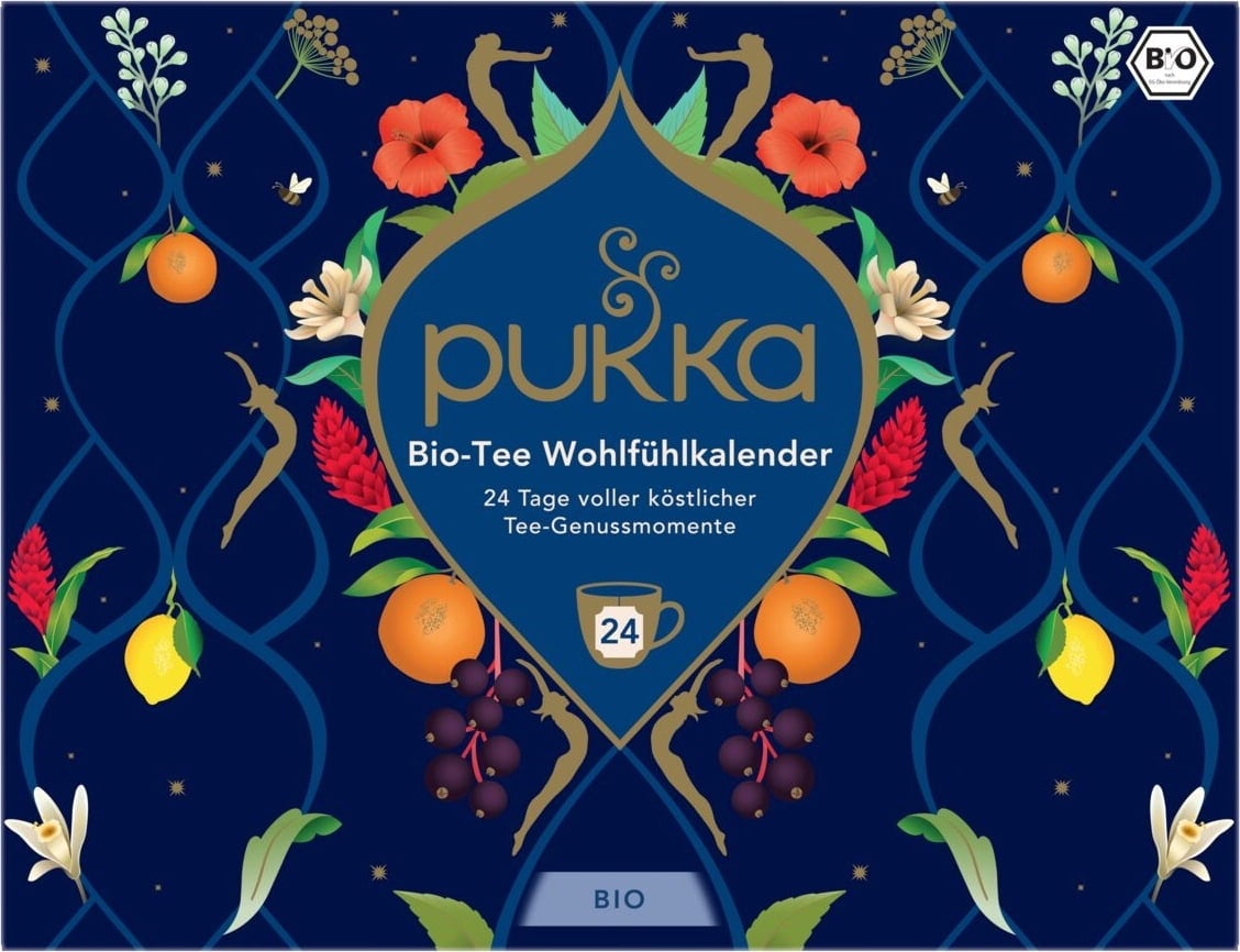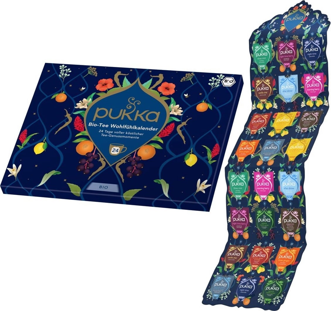 As misturas de chá de alta qualidade adoçam todos os dias do período pré-natalício e trazem alegria. O calendário de bem-estar da PUKKA contém composições de chá únicas em saquetas que trazem variedade à vida quotidiana do Advento - quer seja para si ou para oferecer.