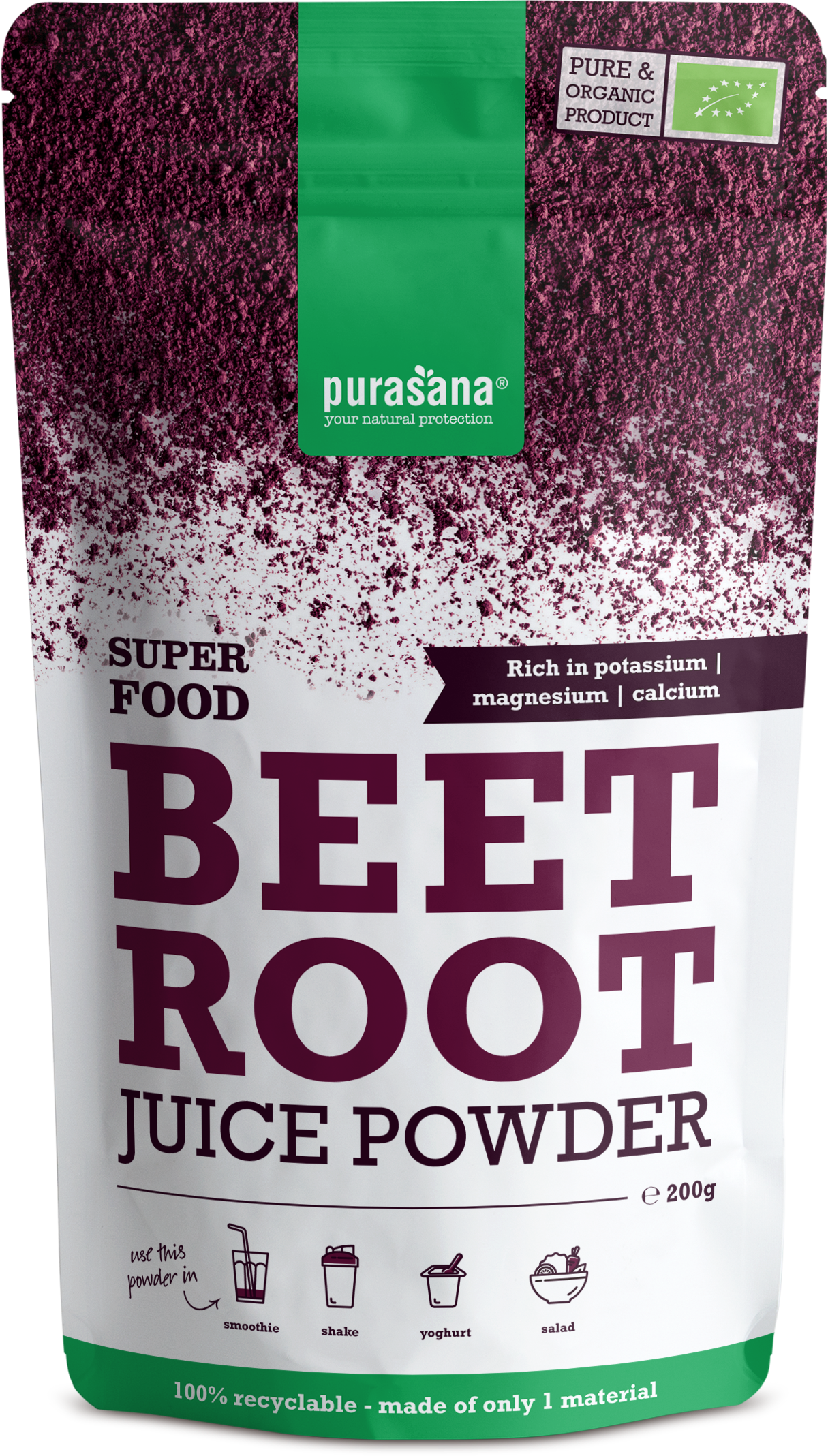 Beetroot BIO da Purasana é feito a partir do sumo de beterraba madura. A beterraba é muito nutritiva, contém muita fibra e é rica em vitaminas A, B e C, potássio, magnésio e ferro.