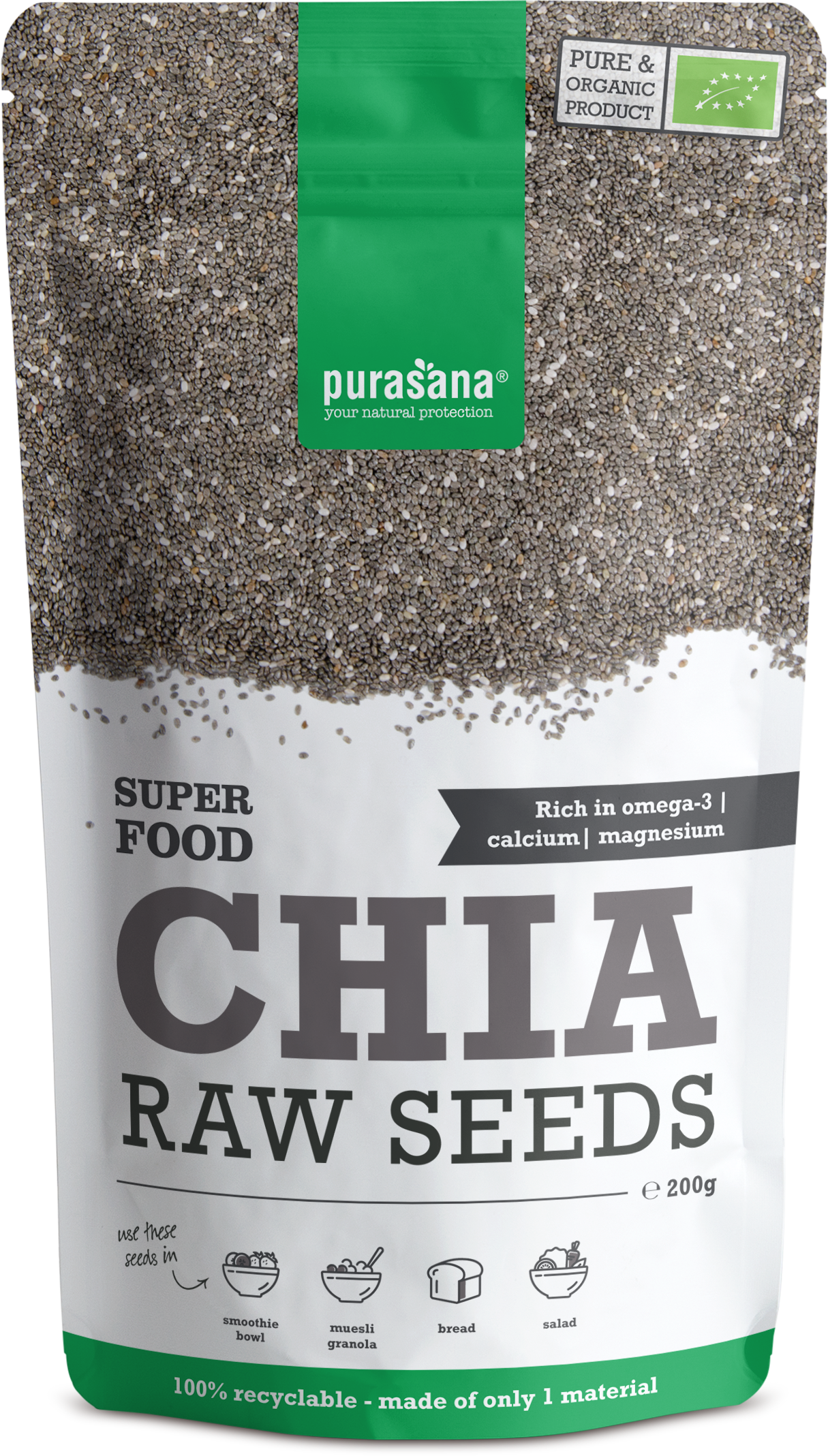 A erva chia é originária da América do Sul. Eles têm uma proporção ideal de numerosos nutrientes e substâncias vegetais secundárias. As sementes de chia orgânicas da Purasana não são processadas e não contêm aditivos.