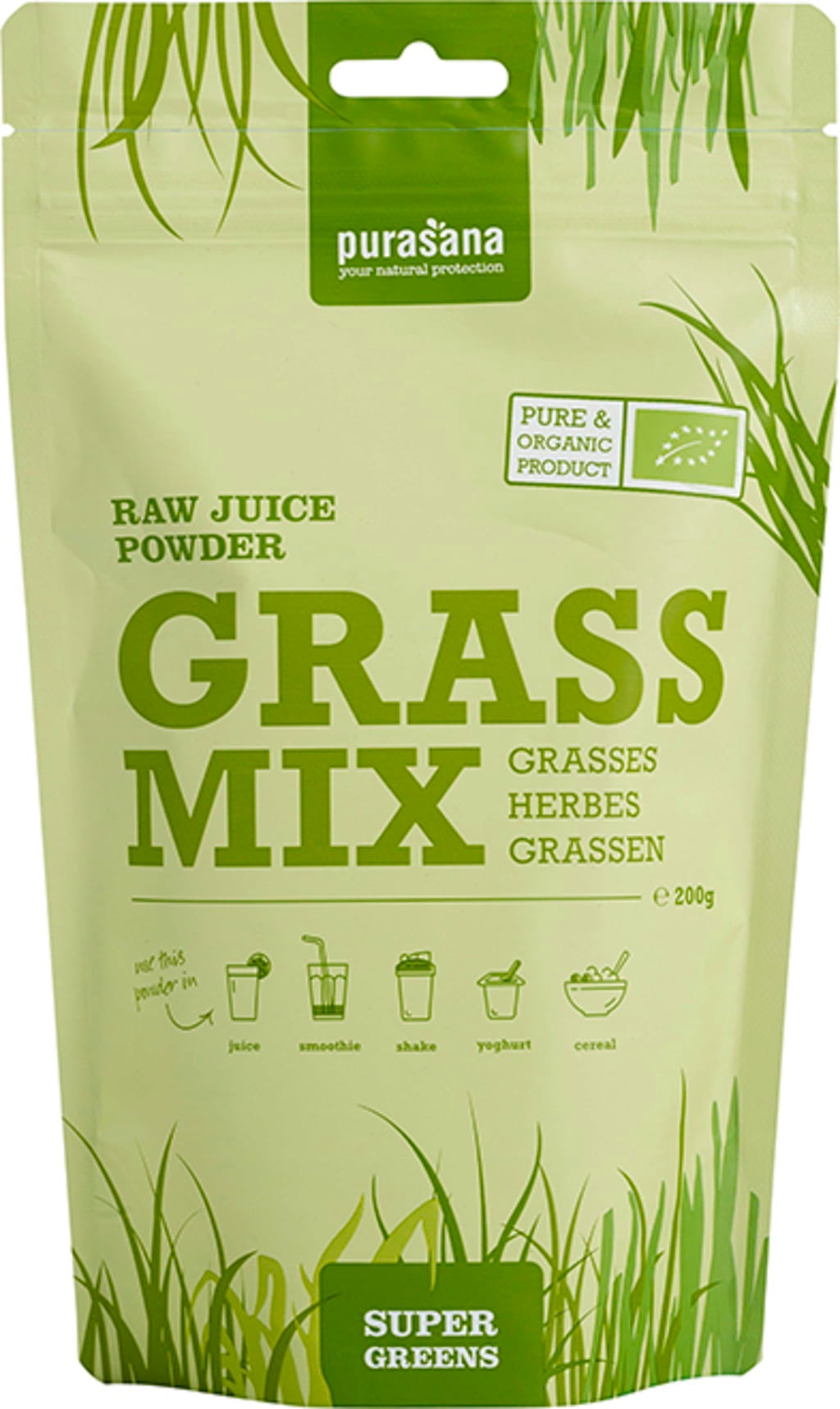 O sumo em pó Grass Mix é uma mistura de sumo de erva de cevada, sumo de erva de trigo, sumo de alfafa, sumo de camu e sumo de erva de aveia em pó. Os rebentos utilizados são prensados a frio logo após a colheita e transformados no sumo em pó de alta qualidade. Basta misturar o pó em sumos, smoothies, batidos ou iogurtes e mueslis.