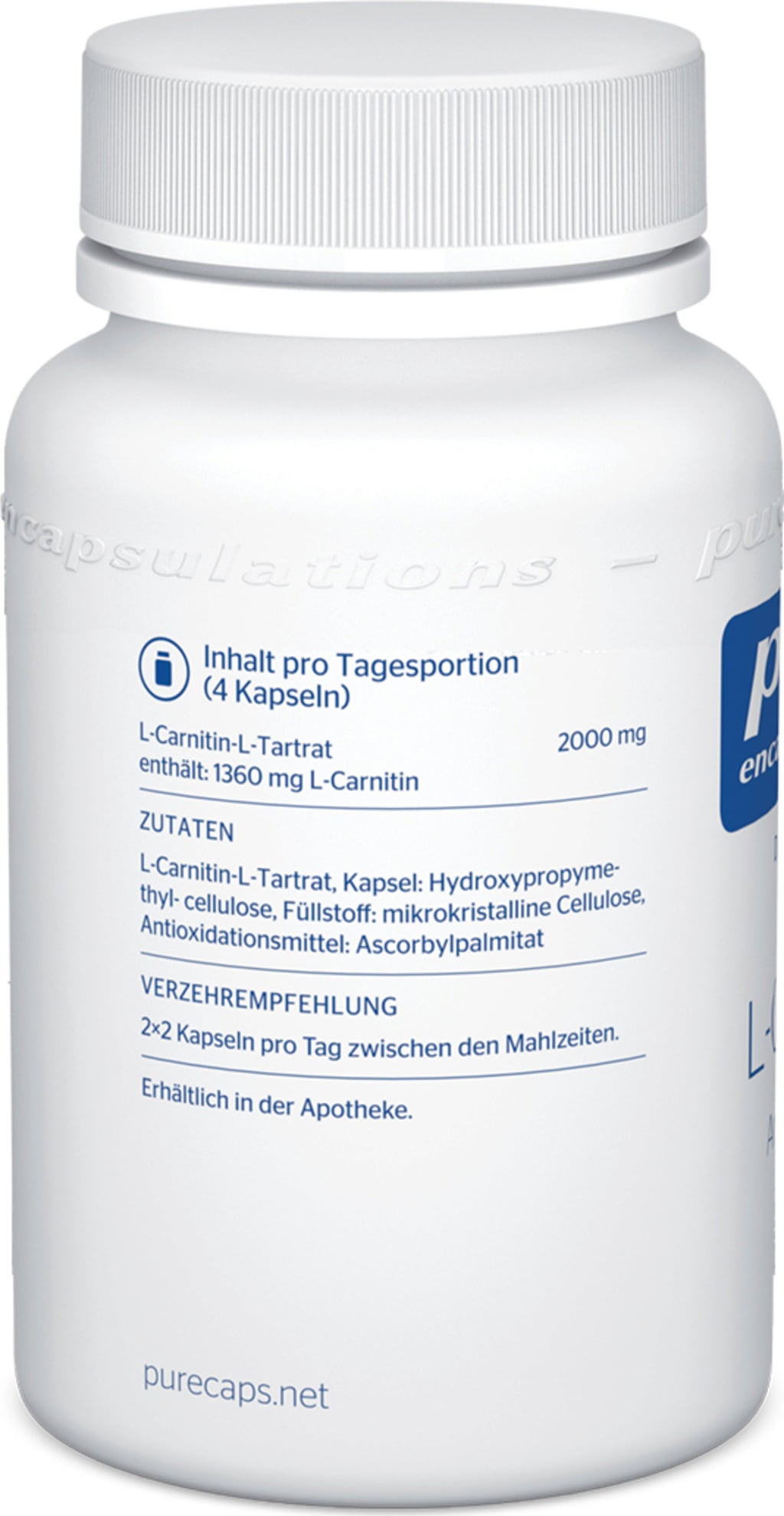 As cápsulas de Pure Encapsulations® contêm 2000 mg de L-carnitina-l-tartarato por dose diária (4 cápsulas).