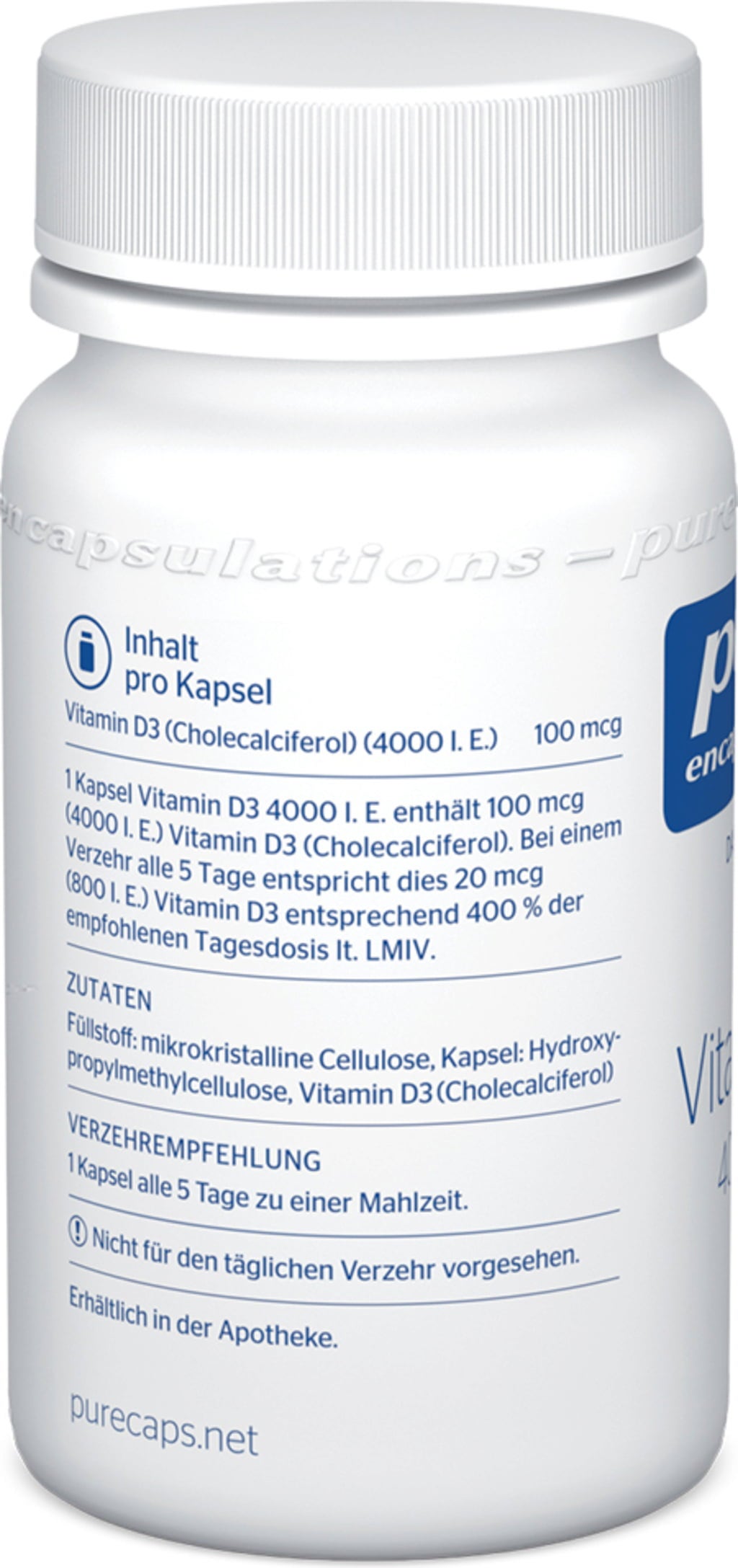 - 1 cápsula de vitamina D3 4000 I. E. contém 100 mcg (4000 I. E.) de vitamina D3 (colecalciferol). Quando consumida de 5 em 5 dias, corresponde a 20 mcg (800 I. E.) de vitamina D3, o que corresponde a 400 % da dose diária recomendada de acordo com a LMIV.