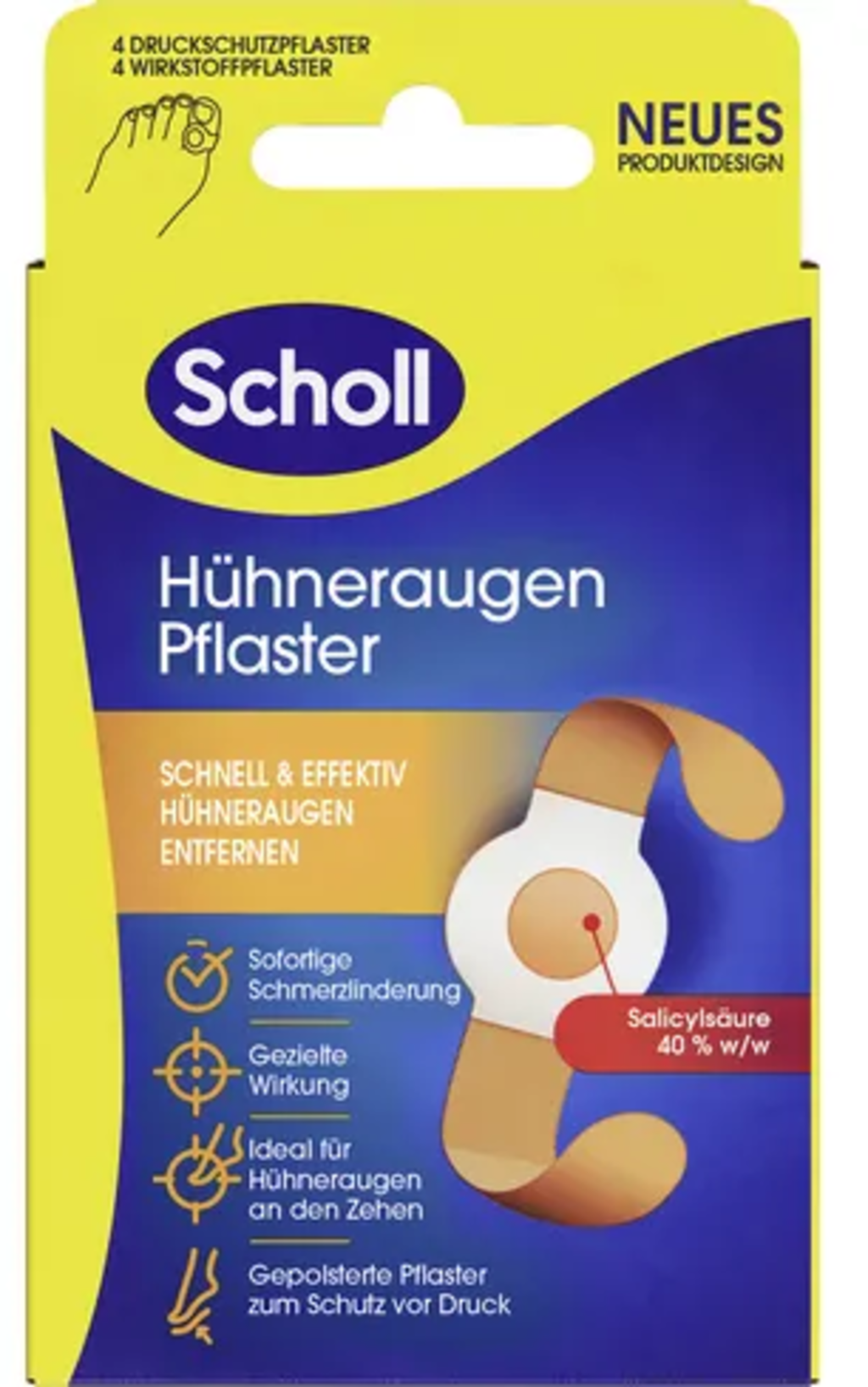 Os emplastros de proteção contra a pressão à prova de água da Scholl contêm ácido salicílico e permitem uma aplicação direcionada aos calos nos pés. Graças ao acolchoamento macio, os emplastros garantem um conforto ótimo durante o uso.