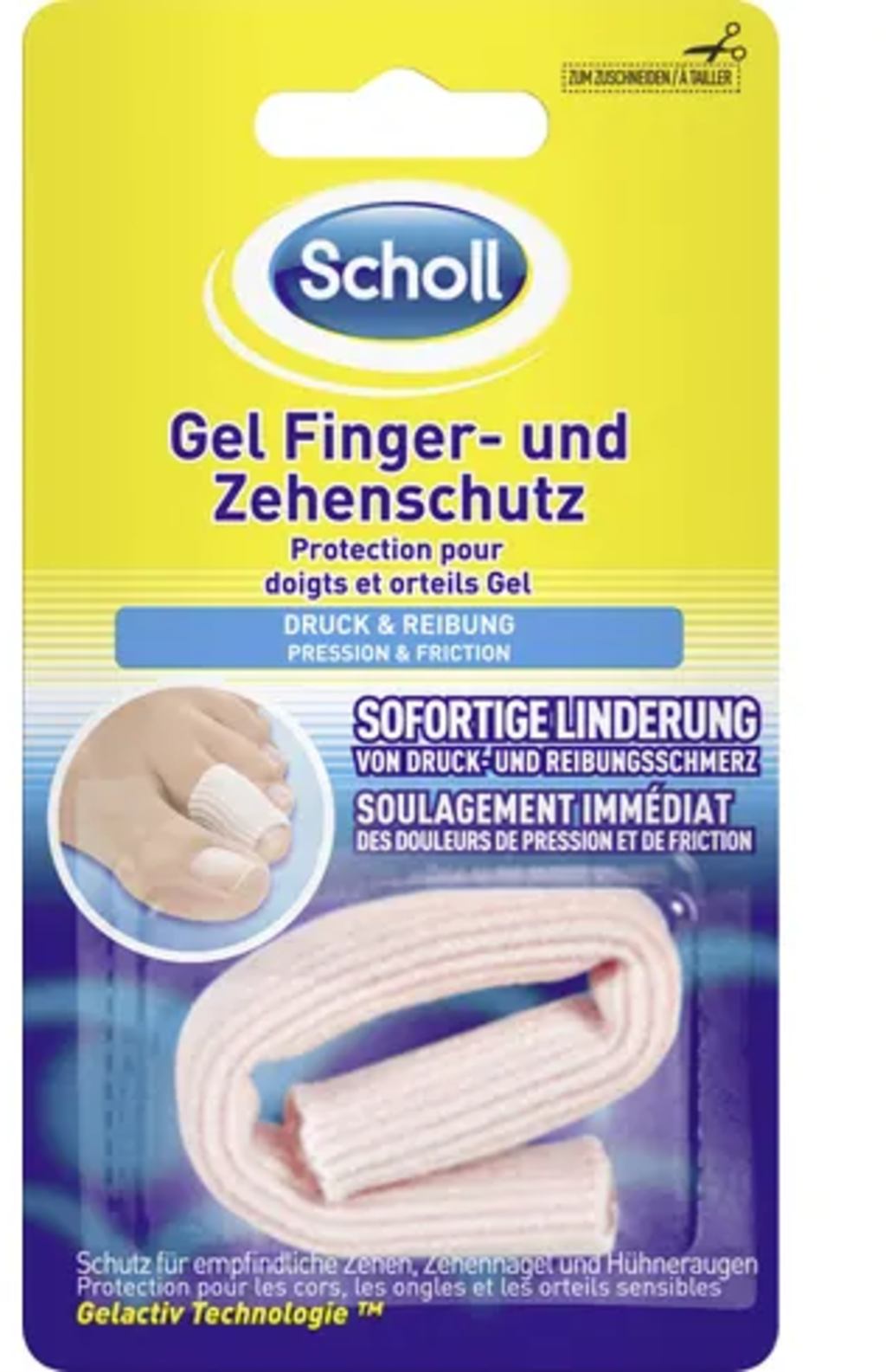 O Protetor de Dedos Scholl Gel, com a sua camada interior especialmente suave, protege as zonas sensíveis dos dedos das mãos e dos pés contra o atrito e a pressão. Como o protetor pode ser facilmente cortado à medida desejada com umas tesouras, oferece um conforto ótimo. Se desejado, o produto também pode ser lavado e reutilizado.