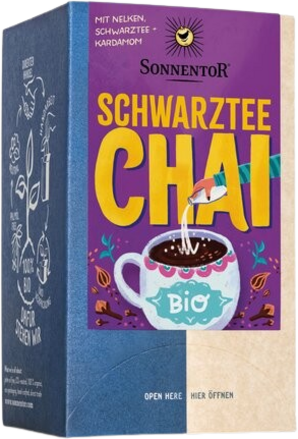 O chai clássico não pode, naturalmente, dispensar o chá preto. A mistura Chai de chá preto da Sonnentor combina chá preto com especiarias selecionadas, como cardamomo, gengibre, canela, cravinho, funcho e anis-estrelado. Uma experiência de sabor exótica que fica deliciosa quando apreciada com leite ou bebida vegetal.
