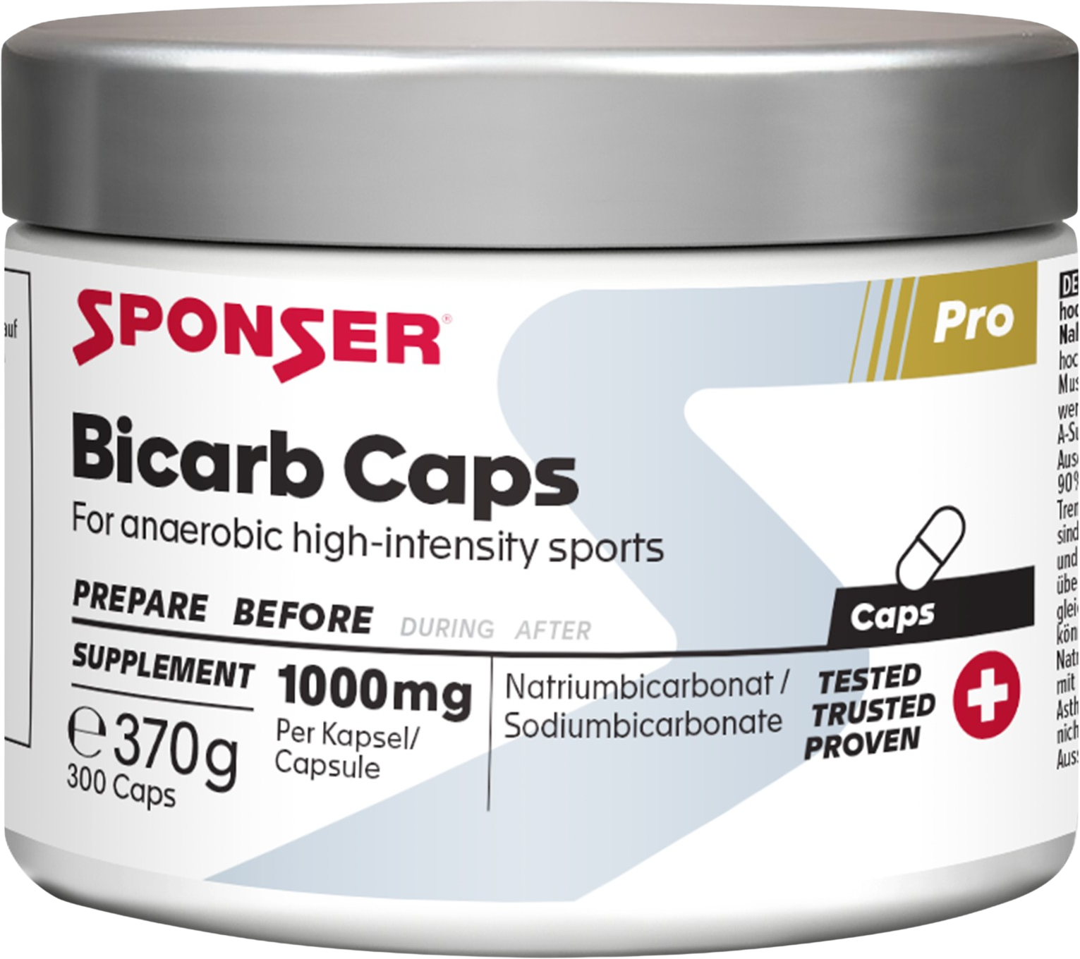 As Sponser Bicarb Caps contêm bicarbonato de sódio em doses precisas por cápsula. Cada cápsula fornece 1 g de bicarbonato de sódio, que aumenta a capacidade tampão do sangue. A forma em cápsula permite uma administração fracionada e uma adaptação individual consoante o peso corporal.