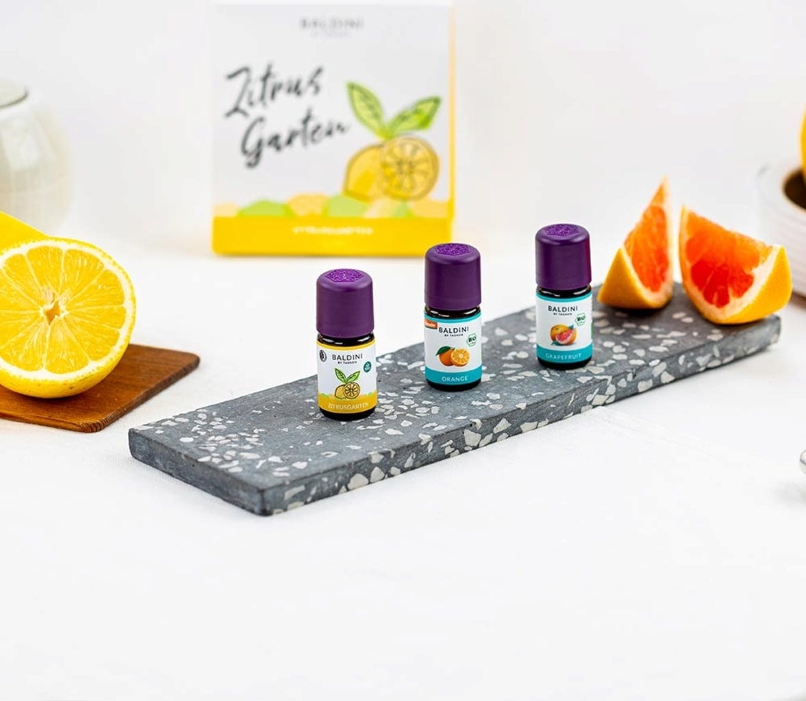 Com este conjunto de fragrâncias, podes iniciar a tua viagem ao paraíso dos citrinos. As composições de fragrâncias estivais (laranja, limão, Zitrusgarten®) são compostas por óleos essenciais 100% naturais e podem ser utilizadas de diversas formas, tanto em cosmética como em alimentos e bebidas. Independentemente da forma como utilizes os óleos, irão certamente ajudar-te a enfrentar o dia com o máximo de energia.