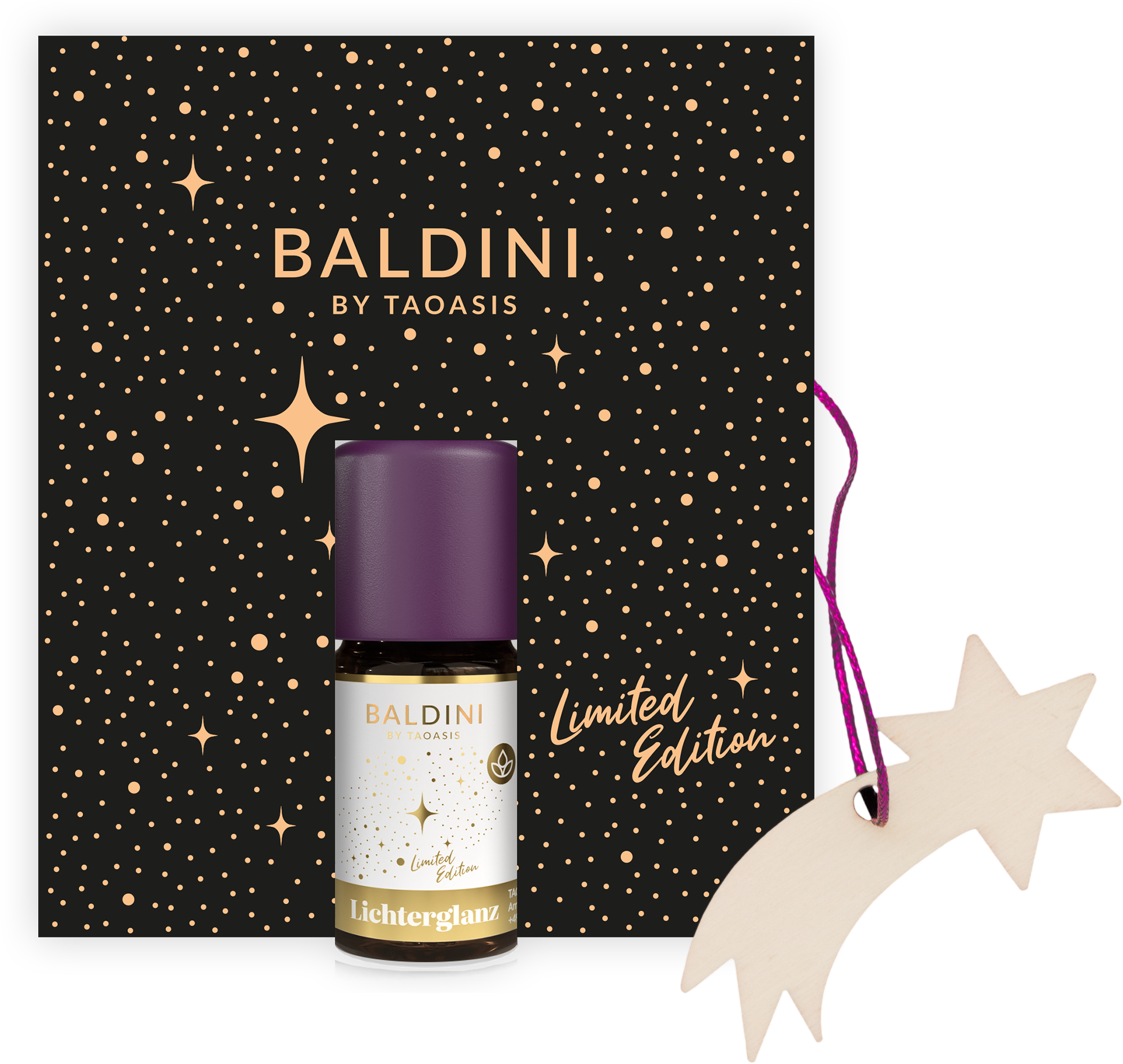 Este conjunto de oferta inclui o óleo perfumado “Luzes Cintilantes” e um pendente em madeira. O óleo perfumado combina bergamota, raiz de íris e benjoim para criar uma composição sensual, quente e festiva.