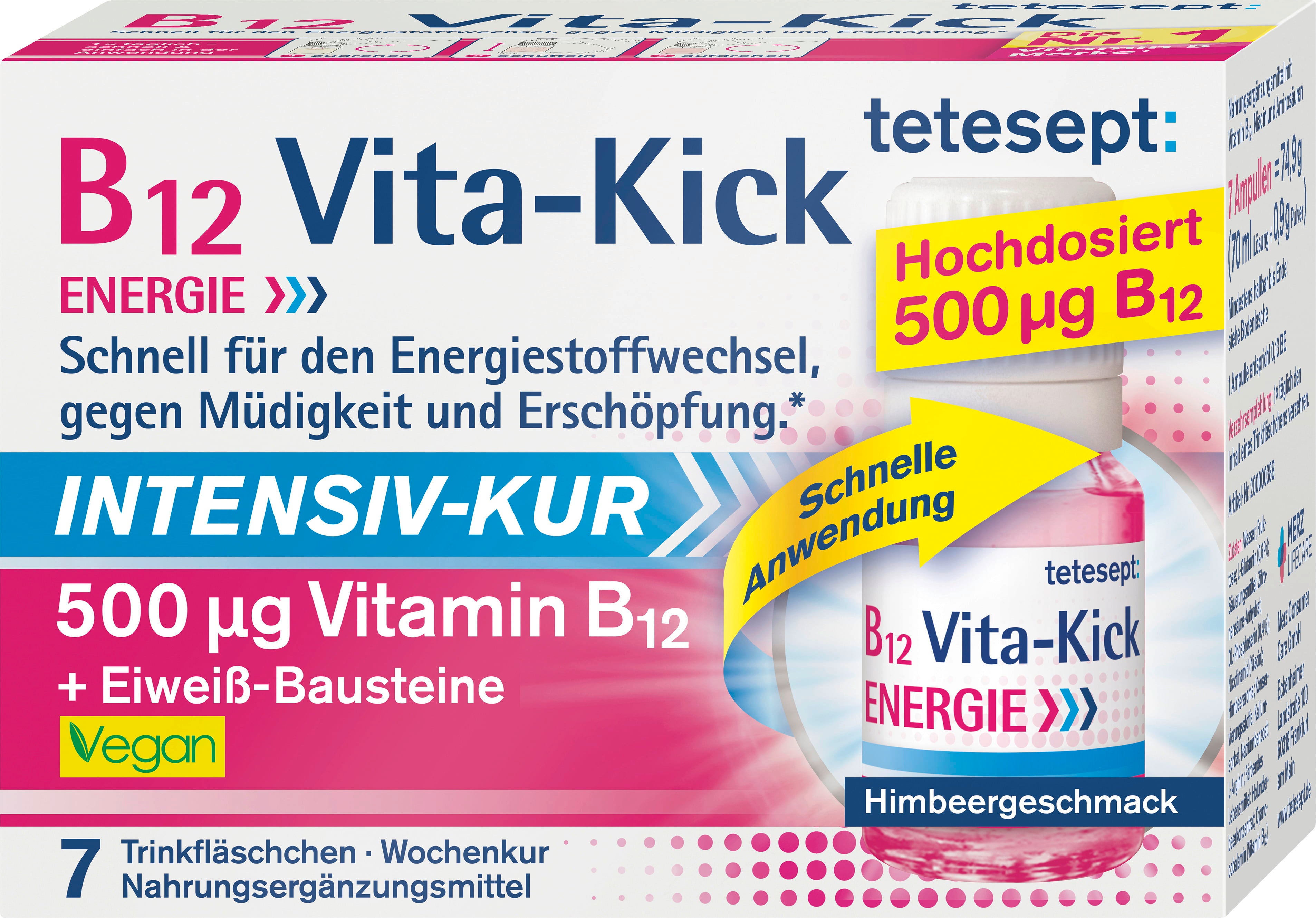 Os frascos para beber B12 Vita-Kick da tetesept contêm 500 μg de vitamina B12 por frasco. A fórmula é vegana e isenta de glúten e lactose.