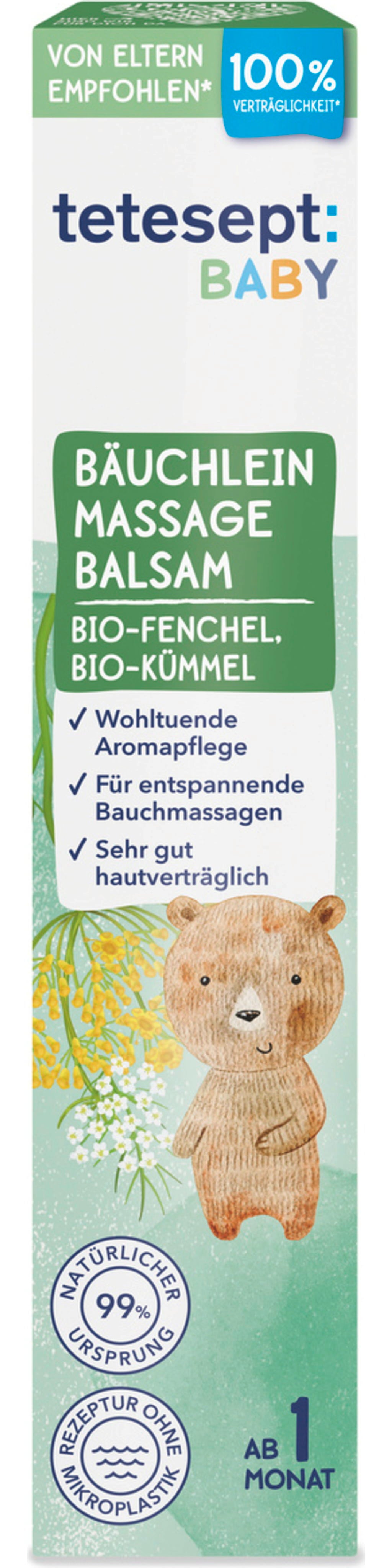 O Bálsamo de Massagem Barriguinha Baby da tetesept mima a pele dos bebés a partir do primeiro mês de vida com óleo Bio de funcho, óleo Bio de cominho, óleo Bio de lavanda e óleo de anis. A formulação fornece uma hidratação valiosa e é livre de microplásticos.