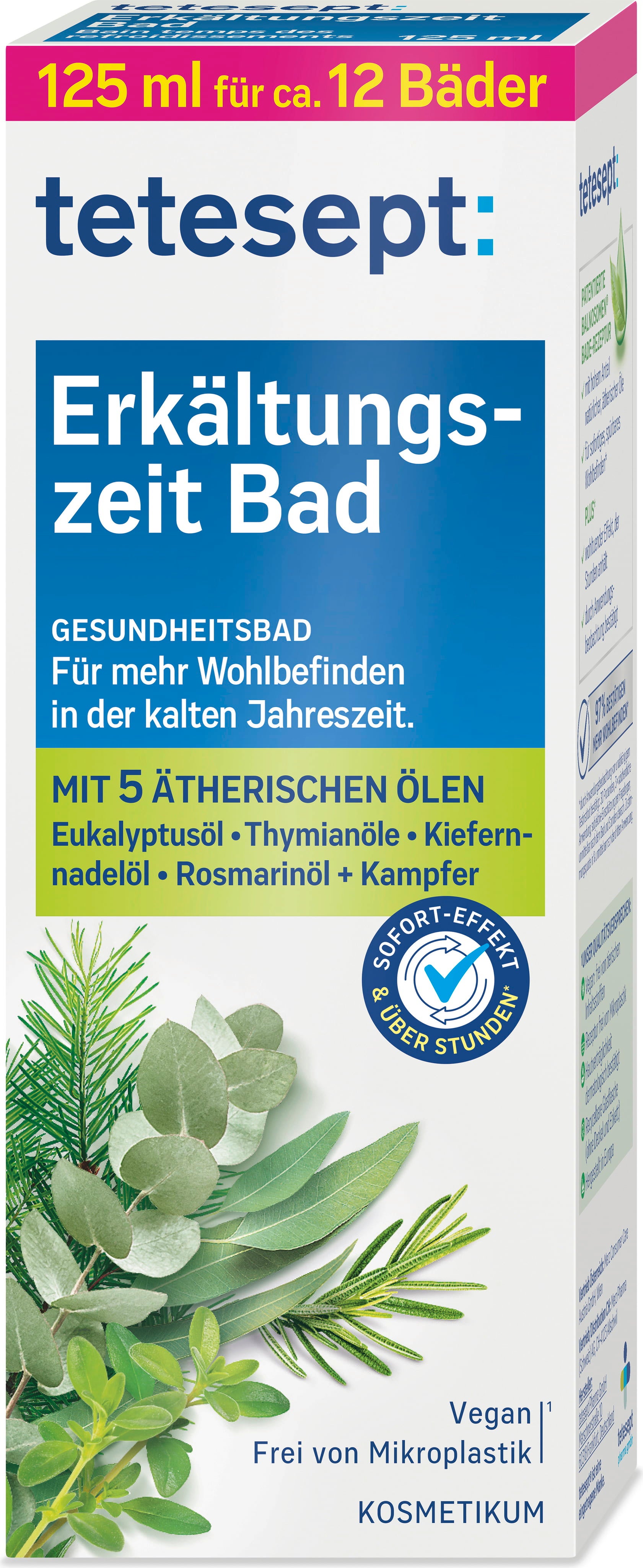 Especialmente na estação fria e chuvosa, é maravilhoso recompensar-se ao fim de um longo dia com um banho quente e relaxante! O Aditivo de Banho - Tempos Frios da tetesept é a escolha perfeita para isso. A sua formulação vegan, sem PEGs, possui propriedades de cuidado da pele e contém exclusivamente óleos essenciais naturais de eucalipto, agulhas de pinheiro, tomilho e alecrim.