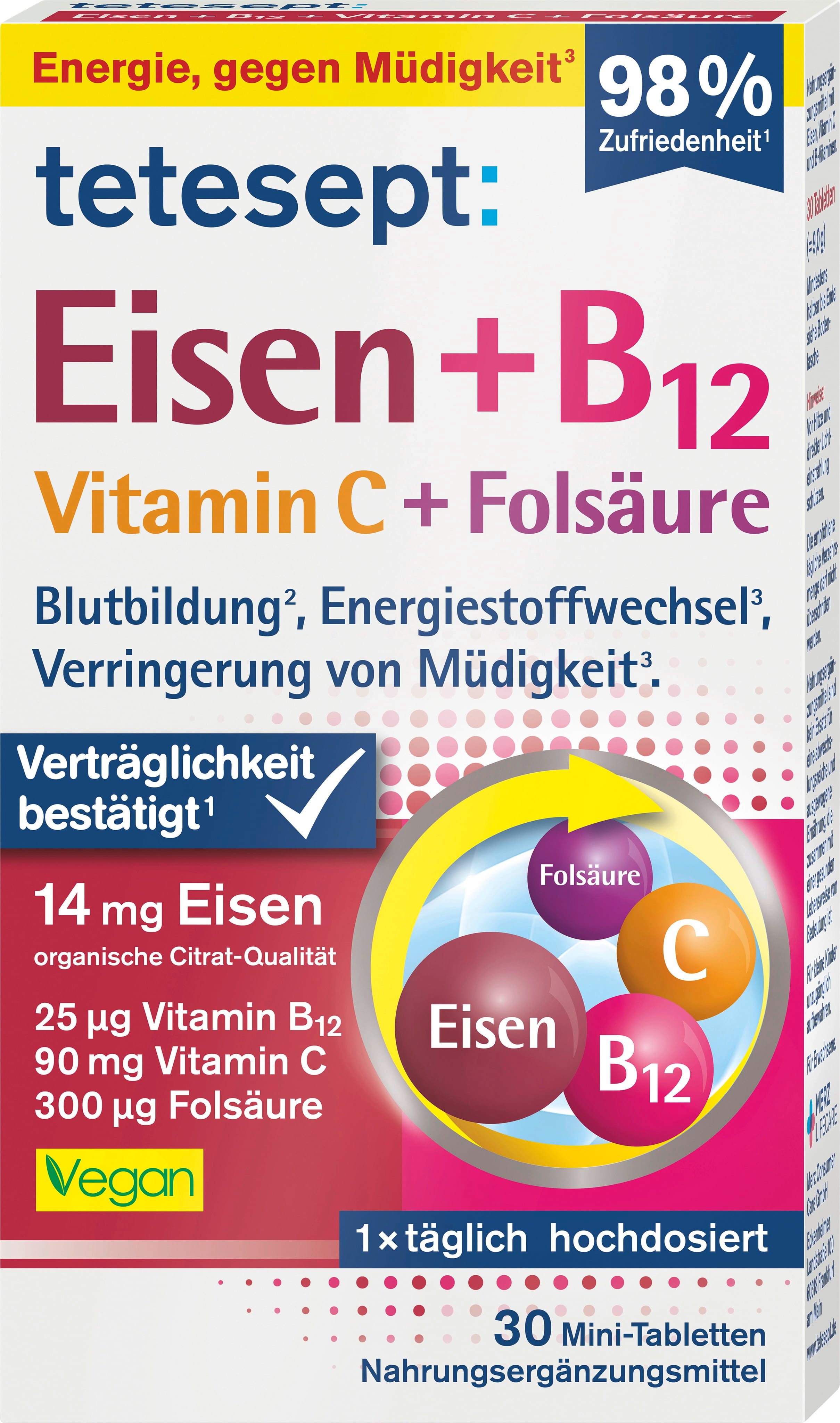 Uma alimentação equilibrada inclui também um fornecimento adequado de ferro. Estes comprimidos da tetesept apoiam-te de forma ideal no dia a dia. Contêm, entre outros, ferro, vitamina B12, vitamina C e ácido fólico. A fórmula é vegana e isenta de glúten e lactose. Graças à prática forma mini em comprimidos, a toma é particularmente simples.