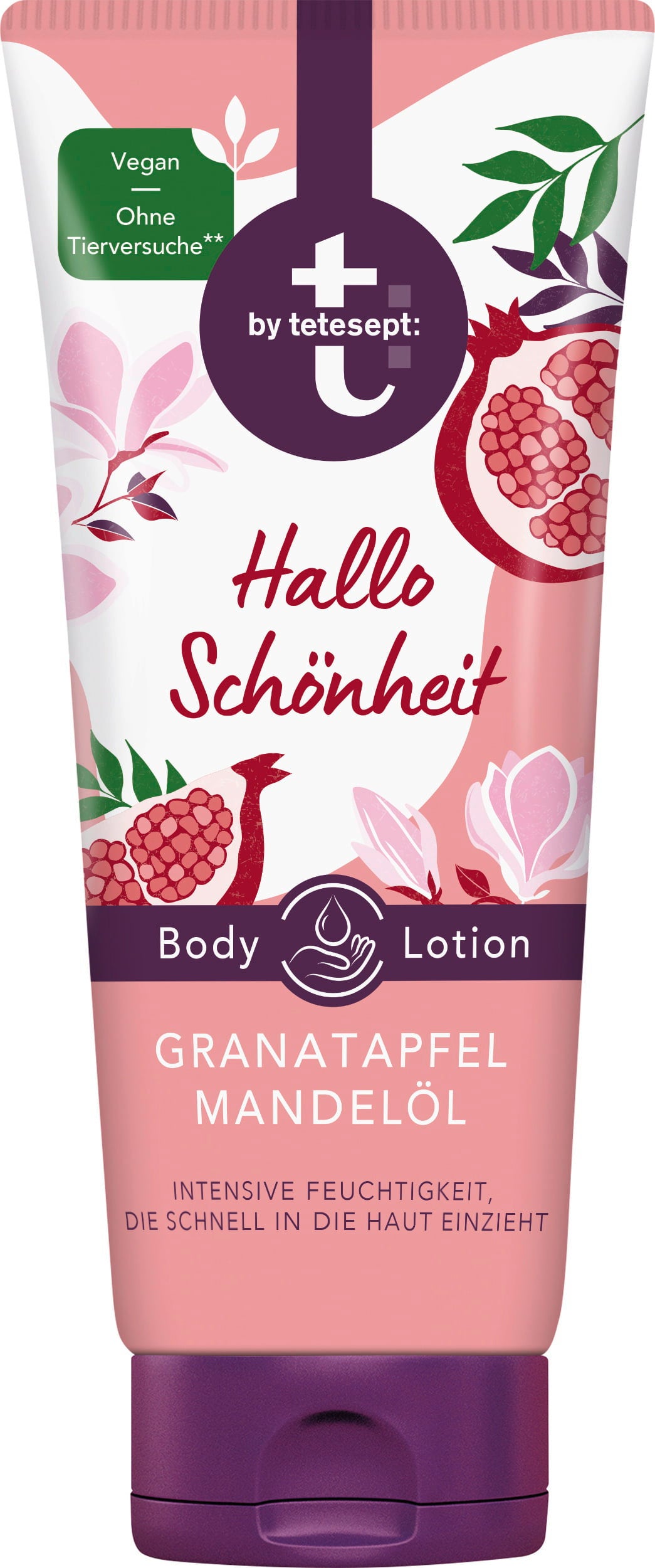 Oferece à tua pele uma dose extra de cuidado com a Loção Corporal Hallo Schönheit da tetesept! Com a sua formulação pH neutro para a pele, fornece uma hidratação valiosa e um cuidado nutritivo. A formulação é totalmente livre de óleos minerais, silicones, testes em animais, ingredientes de origem animal e parafinas, encantando ainda com a sua delicada fragrância de romã e óleo de amêndoas!