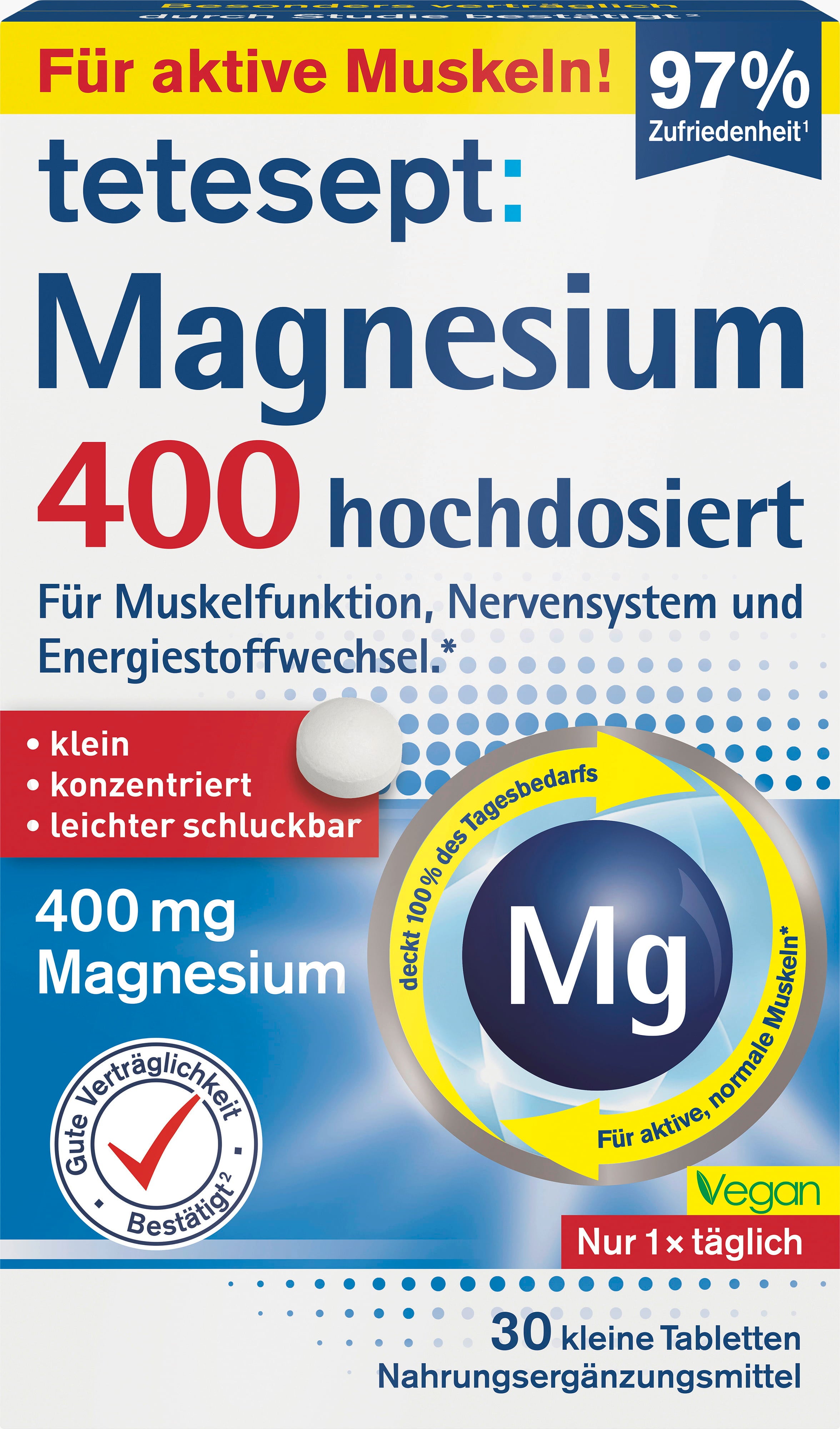 Os comprimidos de Magnésio 400 da tetesept são de alta dosagem, veganos e isentos de glúten e lactose. Graças ao pequeno formato dos comprimidos, podem ser tomados diariamente sem esforço.