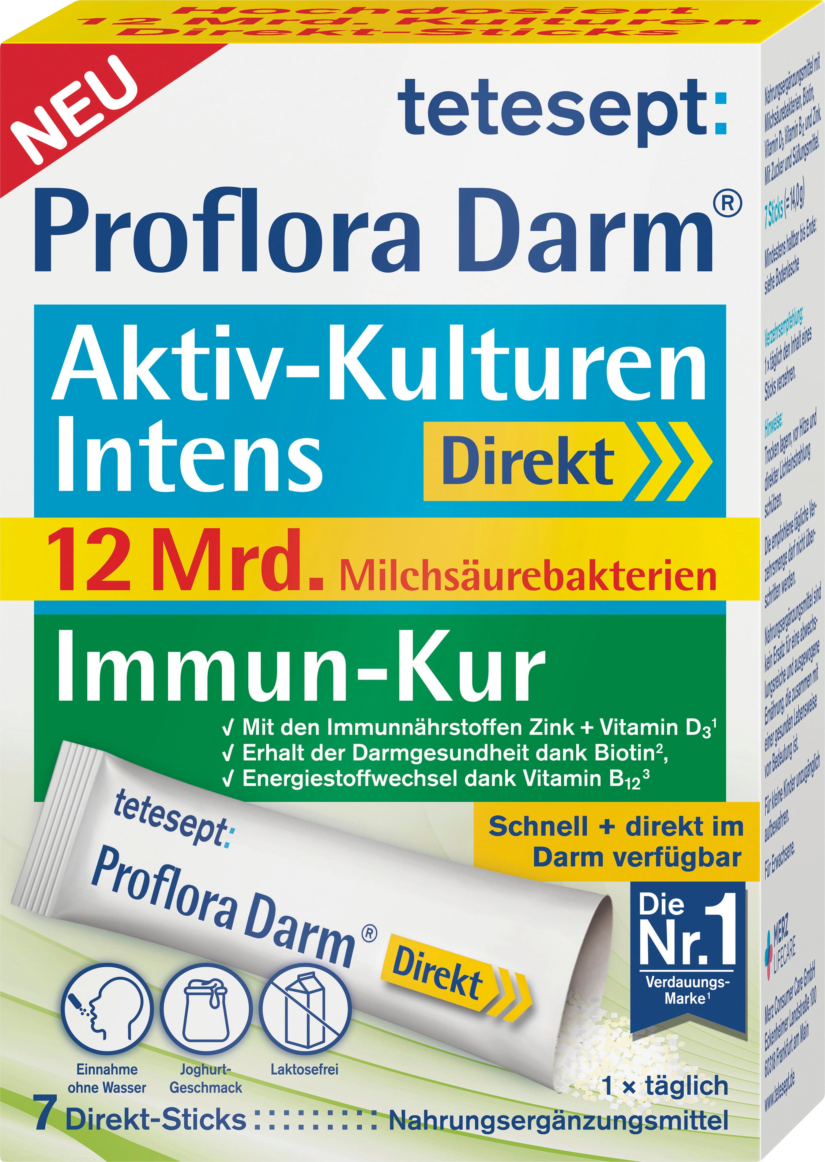 Proflora Ativo-Culturas Intestinais Intens Diret Sticks da tetesept contém 12 mil milhões de bactérias do ácido lático das estirpes Lactobacillus Rhamnosus, Lactobacillus Reuteri e Lactobacillus Plantarum. Os sticks diretos são também enriquecidos com zinco, biotina, vitamina D3 e vitamina B12. O pó é isento de glúten e de lactose.