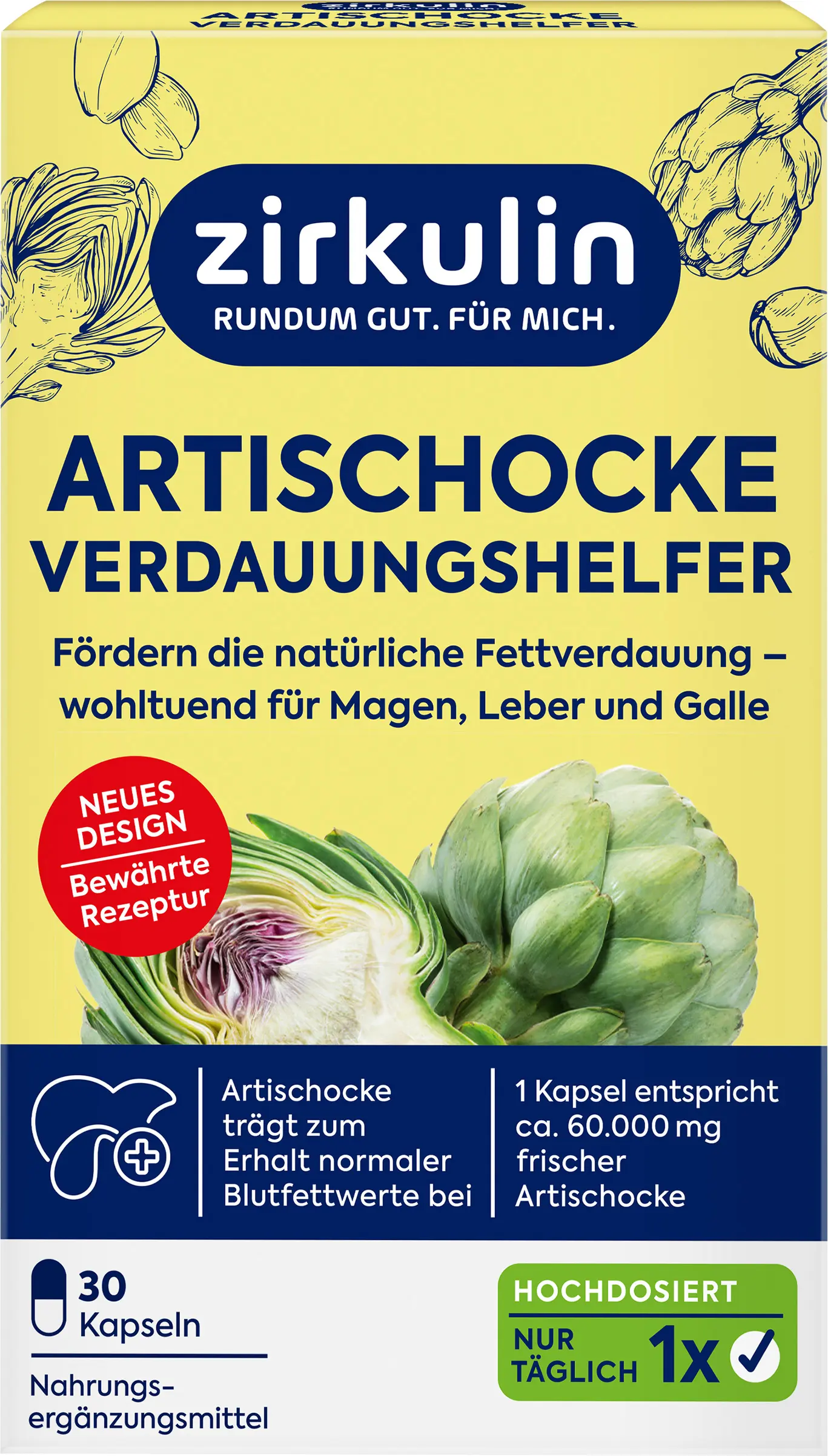 Uma refeição abundante e rica em gorduras, o álcool ou situações de stress podem sobrecarregar rapidamente o fígado e o sistema biliar. As cápsulas de extrato de alcachofra em dose elevada de Zirkulin são enriquecidas com extratos de alcachofra e de raiz de genciana para um apoio ideal. A fórmula é vegana e não contém óleo de palma, corantes ou açúcares adicionados.