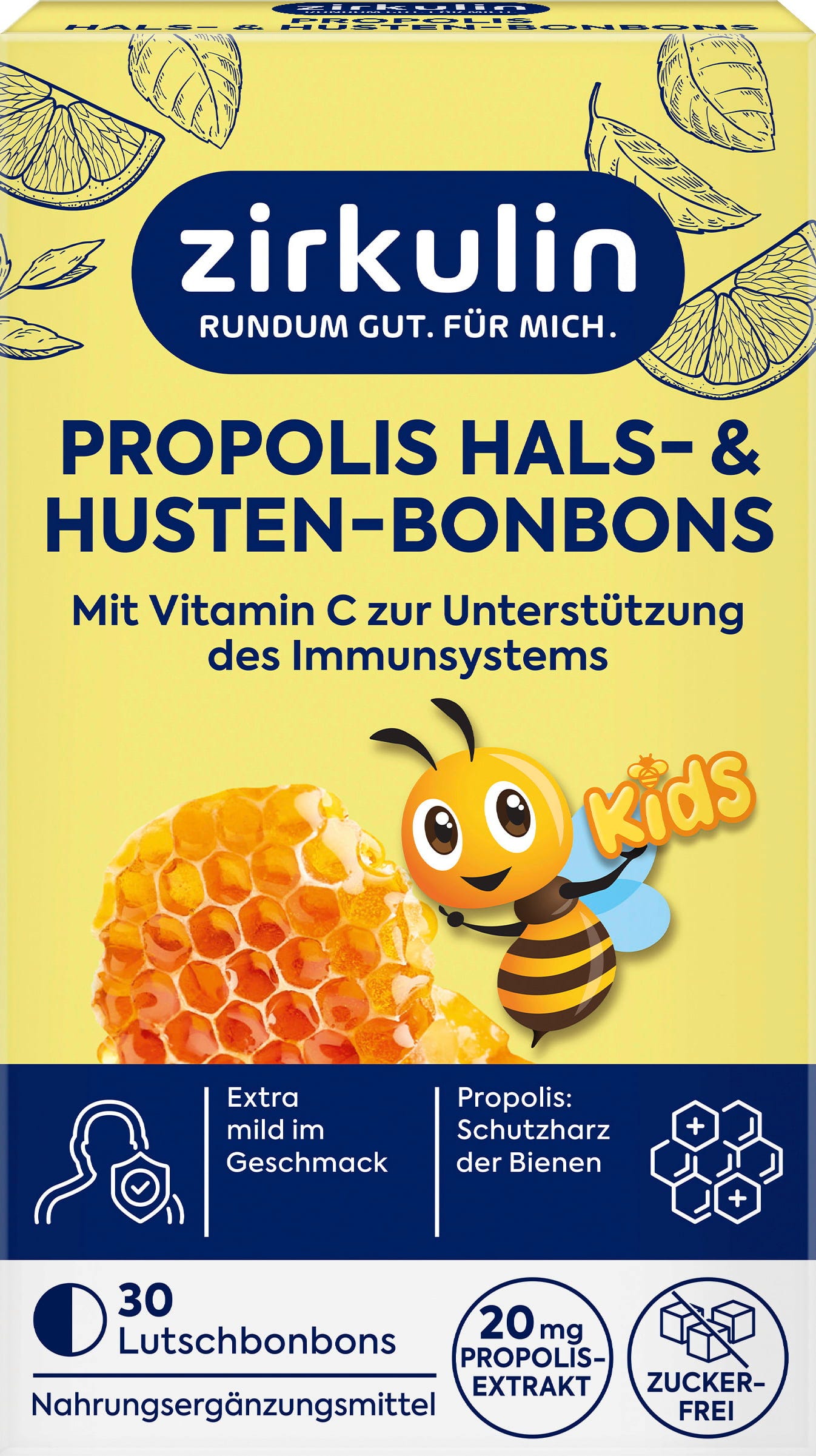 Os rebuçados de própolis para a tosse e garganta da linha Kids da zirkulin têm um sabor suave graças ao seu aroma a laranja-mel e são adequados para crianças a partir dos 4 anos de idade. Não contêm açúcares adicionados e são enriquecidas com vitamina C.